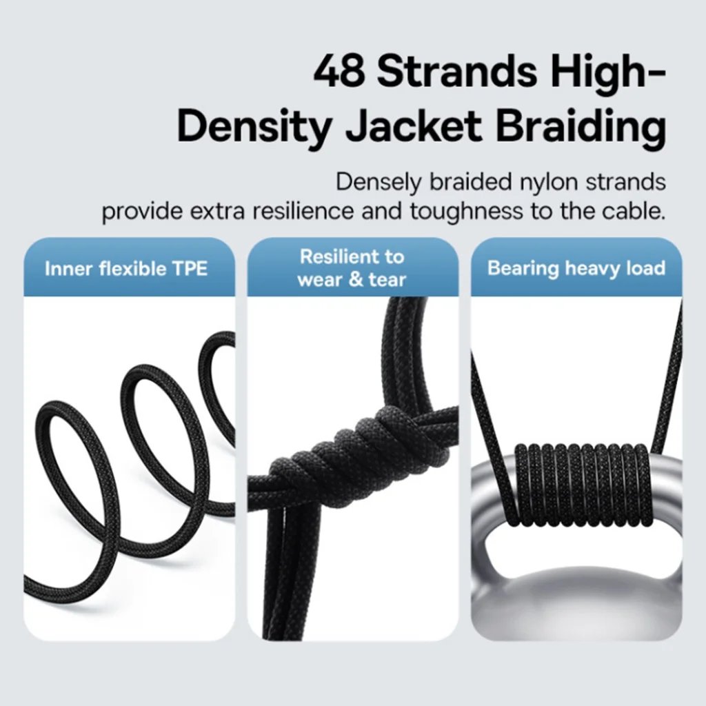 A 48 szálas, nagy sűrűségű nejlon fonott borítás kivételes rugalmasságot és szívósságot kölcsönöz a kábelnek. Ez a sűrű fonás ellenáll a kopásnak, szakadásnak és a mindennapi használat során fellépő hajlításoknak, csavarásoknak, miközben nagy terhelést is képes elviselni. A belső, rugalmas TPE réteg tovább növeli a kábel élettartamát, megakadályozva a belső sérüléseket és biztosítva a stabilitást.