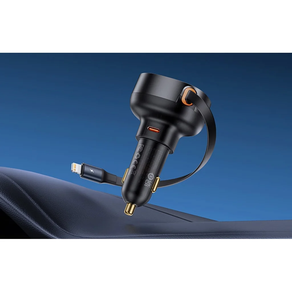 A Baseus Enjoyment Pro autós töltő egy gondosan megtervezett megoldás az utakon való töltési igényeid kielégítésére. A visszahúzható 70 cm-es kábellel, amely mind Lightning, mind USB-C csatlakozóval rendelkezik, ez a töltő egyszerű és gubancmentes használatot biztosít. Akár három eszközt is tölthet egyszerre a beépített USB-A porttal, ezzel időt spórolva és növelve a kényelmet. Élvezd a gyors töltést minden eszközöd számára, így utazás közben is kapcsolatban maradhatsz. Ezek a csatlakozók csökkentik az ellenállást a hatékonyabb töltés és tartósság érdekében. Tartsd rendezetten az autódat a visszahúzható kábelnek köszönhetően, így elkerülheted a kábelek összegabalyodása miatti bosszúságot. Az elegáns világítás megkönnyíti a töltő megtalálását gyenge fényviszonyok között, egy kis eleganciát adva hozzá. Kompatibilis személyautókkal, SUV-okkal és teherautókkal, a Baseus Enjoyment Pro autós töltő tökéletes útitárs minden töltési igényedhez!