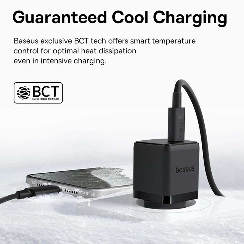 Az exkluzív Baseus Cooling Technology (BCT) egy intelligens hőmérséklet-szabályozási rendszert kínál. Ez optimalizálja a hőelvezetést még intenzív töltés során is, így a töltő és a készülék mindig optimális hőmérsékleten üzemel. Ez nemcsak a töltési hatékonyságot maximalizálja, hanem meghosszabbítja az eszközök élettartamát is.
