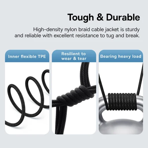 A "Tough & Durable" jelmondatnak megfelelően a Baseus Gem kábel kiváló minőségű, nagy sűrűségű nejlon fonott kábelszállal készült, amely rendkívül strapabíró és ellenálló a húzással és töréssel szemben. A belső rugalmas TPE anyag tovább növeli az élettartamot, biztosítva, hogy a kábel hosszú ideig megőrizze rugalmasságát és ellenálljon a mindennapi igénybevételnek. Az átlátszó csatlakozóház nemcsak esztétikailag lenyűgöző, hanem a kábel prémium minőségét is kiemeli, egy futurisztikus érintéssel.