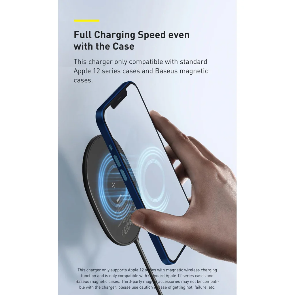 Ha szabványos Apple 12-sorozatú tokot vagy mágneses Baseus tokot használ, akkor nem is kell eltávolítania az okostelefonról a bekapcsoláshoz. Ez egy rendkívül praktikus megoldás, amely valódi kényelmet nyújt és időt takarít meg. Semmi sem akadályozza meg abban, hogy élvezze a gyors töltés előnyeit! Előfordulhat, hogy a töltő nem kompatibilis harmadik fél mágneses tartozékaival.