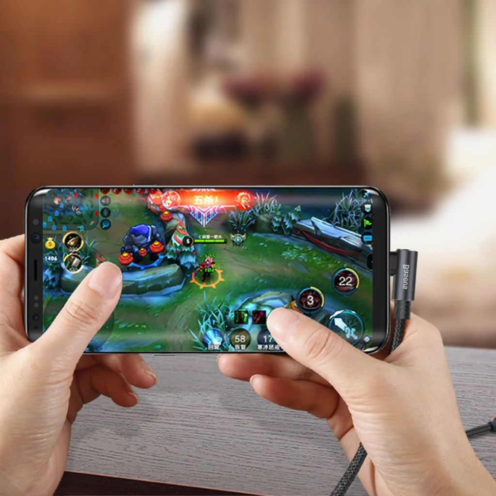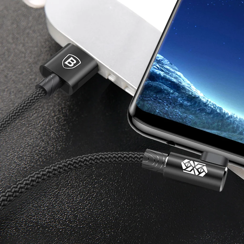 Tartós USB - USB Type-C kábel, könyök típusú csatlakozóval, így töltés közben sem zavarja a kábel a telefon használatát, főleg azok számára, akik sokat játszanak telefonjukon. Kiváló minőségű TPE anyagból készült, speciális nylon- és horgászzsinórral. Gyors és biztonságos töltéssel. Az ónozott rézhuzal gyorsabb és biztonságosabb töltést biztosít.