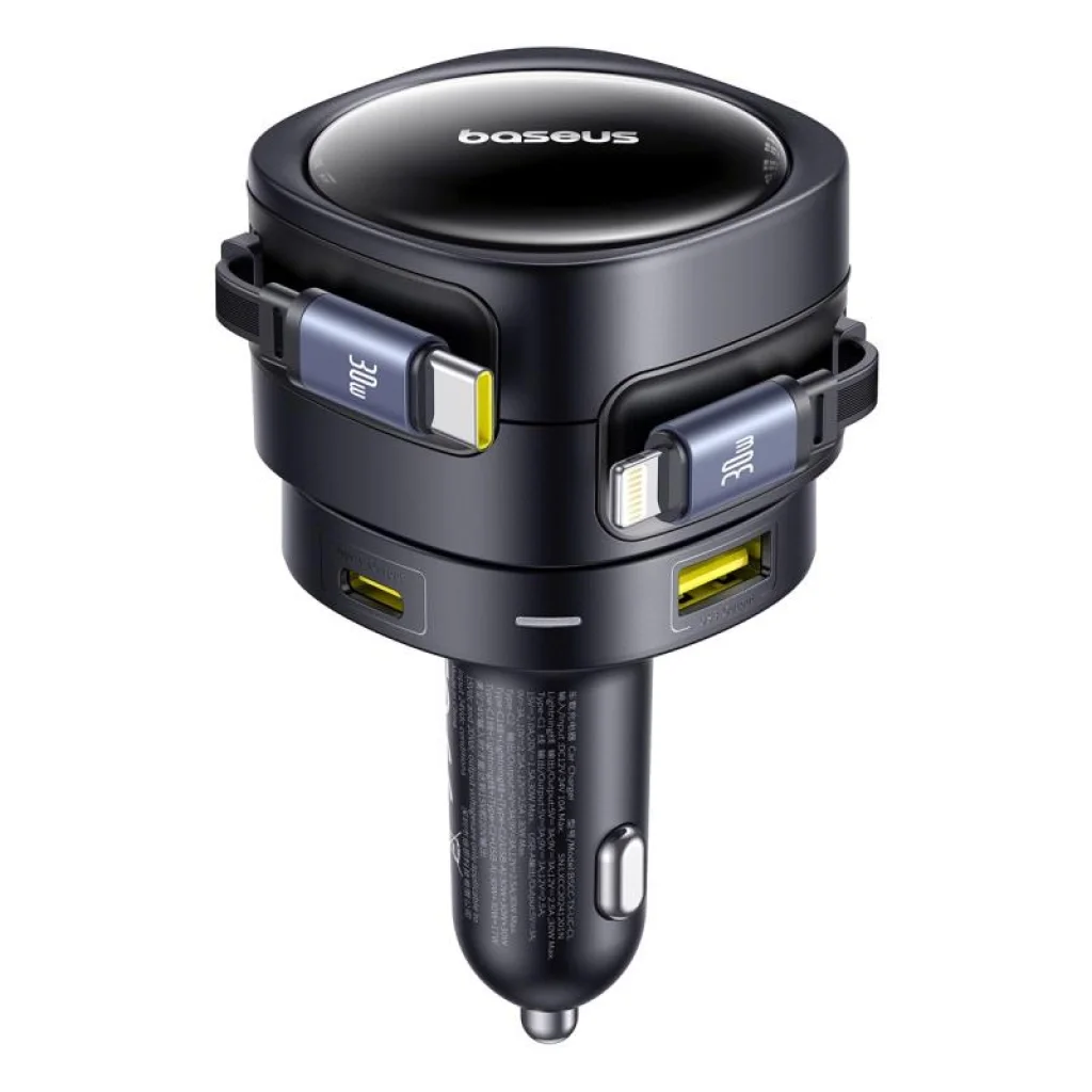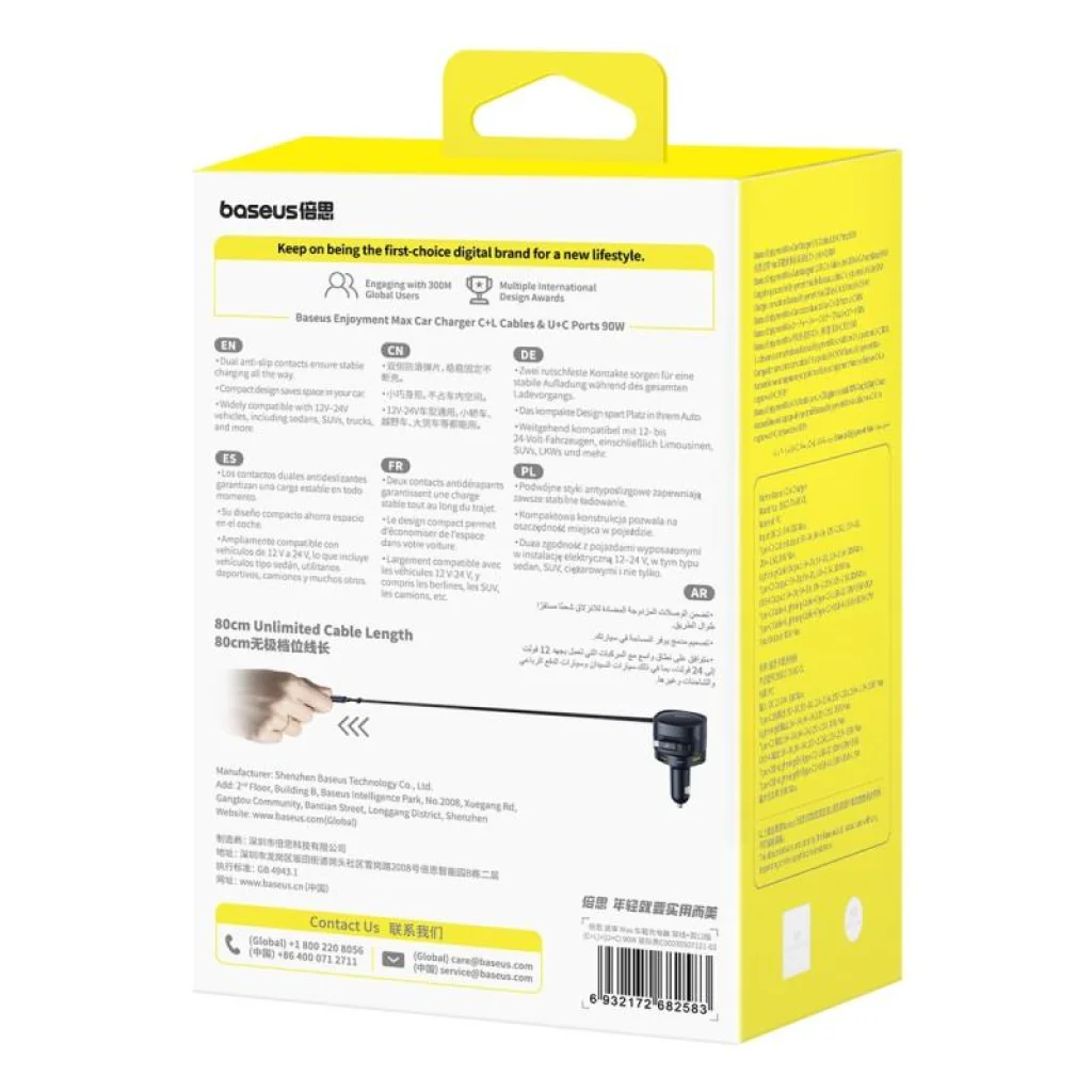 A Baseus Enjoyment Max autós töltő kozmikus fekete színben elegáns és hatékony autós töltő. Beépített C+C kábelekkel és U+C portokkal van felszerelve, összesen 90W teljesítményt támogat, lehetővé téve több eszköz egyidejű gyors töltését. A 180°-ban forgatható kábelkivonó mechanizmus maximális kényelmet biztosít a felhasználónak, így elengedhetetlen társ minden utazáshoz.