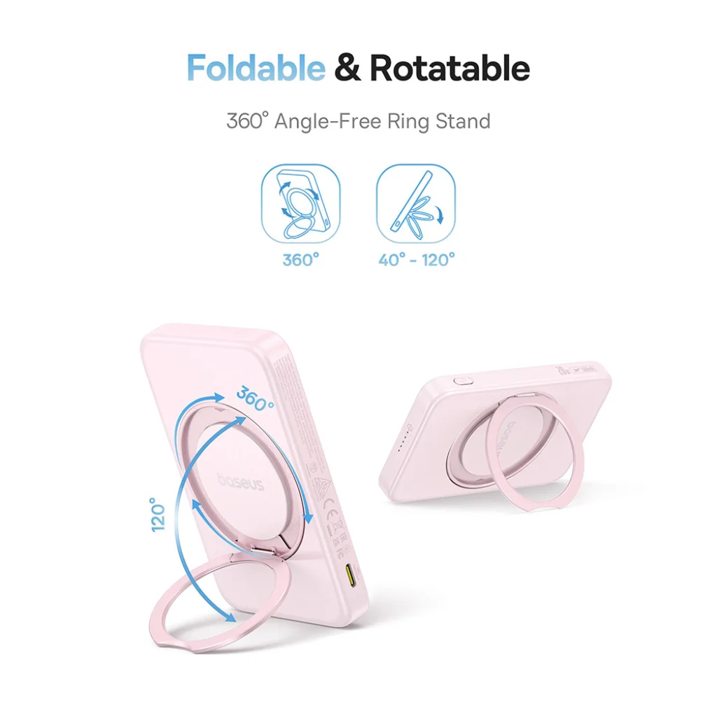 A termék kiemelkedő jellemzője a 360°-ban elforgatható és kihajtható gyűrűs állvány. Ez a funkció lehetővé teszi, hogy telefonját kényelmesen elhelyezze fekvő vagy álló tájolásban videónézéshez, videóhívásokhoz vagy egyszerűen csak a képernyő kényelmes áttekintéséhez, miközben az akkumulátor töltődik. Az állvány 40° és 120° között állítható, így mindig megtalálhatja az ideális látószöget.