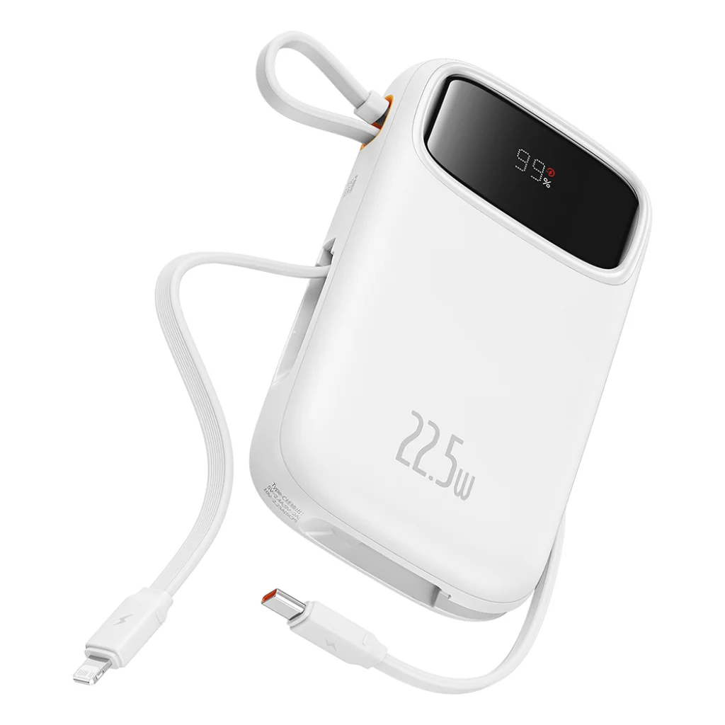 Ez a power bank valóban a kényelemre fókuszál. Nem kell többé külön kábelekkel bajlódnia, hiszen a Baseus Qpow Pro+ két beépített kábellel is rendelkezik: egy Lightning és egy Type-C kábellel. Ezek a kábelek nemcsak töltésre szolgálnak, hanem praktikusan a power bank oldalára integrálva hordozófület is képeznek, így könnyedén magával viheti.