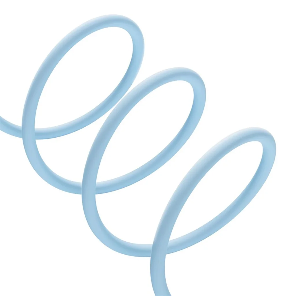 A Baseus Pudding kábel prémium TPE bevonata nem csak gyönyörű, pasztell kék színben pompázik, hanem „gentle to the touch”, azaz rendkívül puha és kellemes tapintású is. Ez az anyag kivételes rugalmasságot biztosít és ellenáll a hajlításnak (több mint 20 000 ciklusban tesztelve!), a szennyeződéseknek és a csavarodásnak, így a kábel hosszú távon megőrzi újszerű állapotát és rendezett külsejét. A csatlakozók megerősített, bordázott kialakítása extra tartósságot és kényelmes fogást biztosít a gyakori csatlakoztatás és leválasztás során.