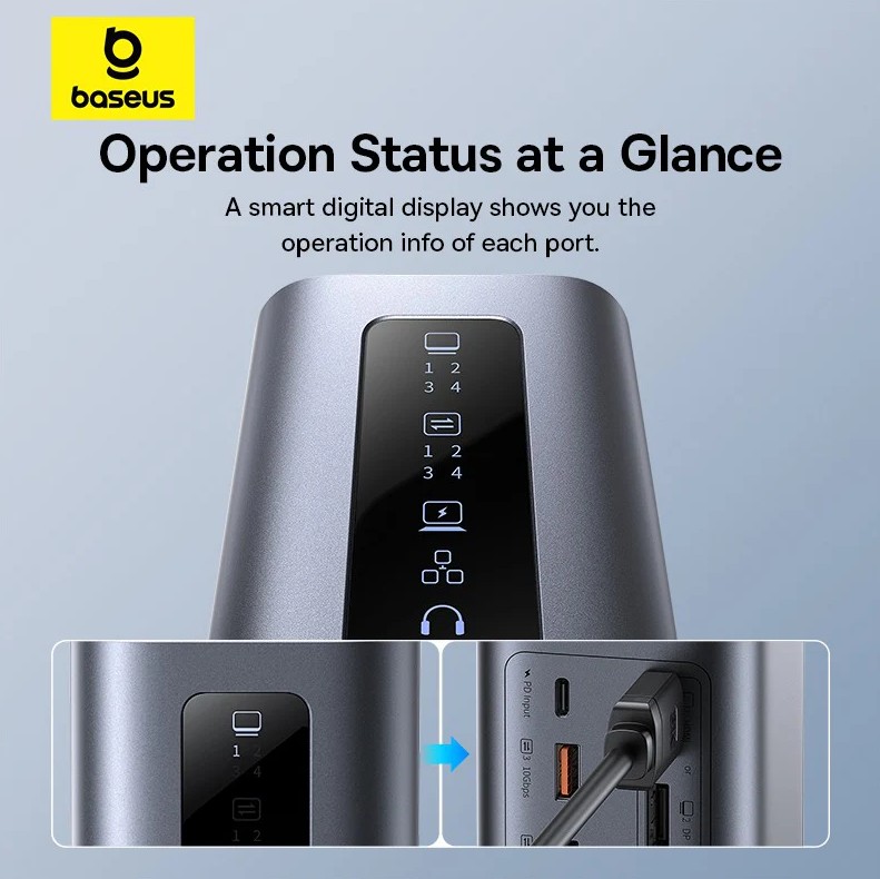- Okos állapotkijelző: A dokkoló tetején található smart digitális kijelző valós időben mutatja az egyes portok működési állapotát, így mindig képben van a csatlakoztatott eszközökről.