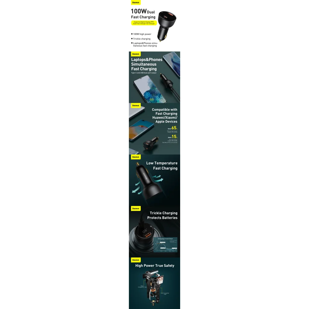 Baseus Supreme 100W Univerzális autós szivargyújtós töltő USB-A és USB Type-C aljzattal QC PD 3.0 5A + Type-C kábel (TZCCZX-01)