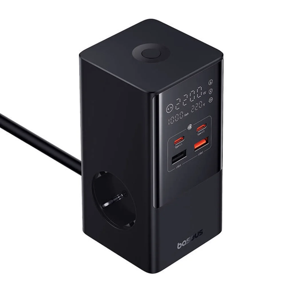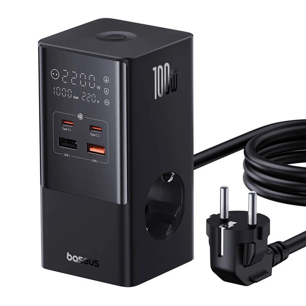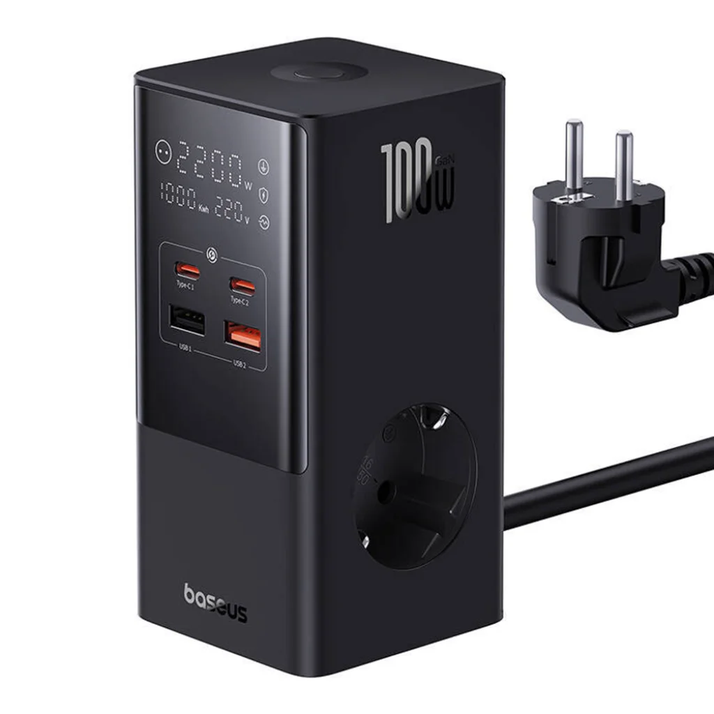 Baseus - Töltőállomás (E00023609113-00) - 2xUSB, 2xType-C, Schuko, LED kijelző, Gyors töltés 100W, 1.5m - Fekete
