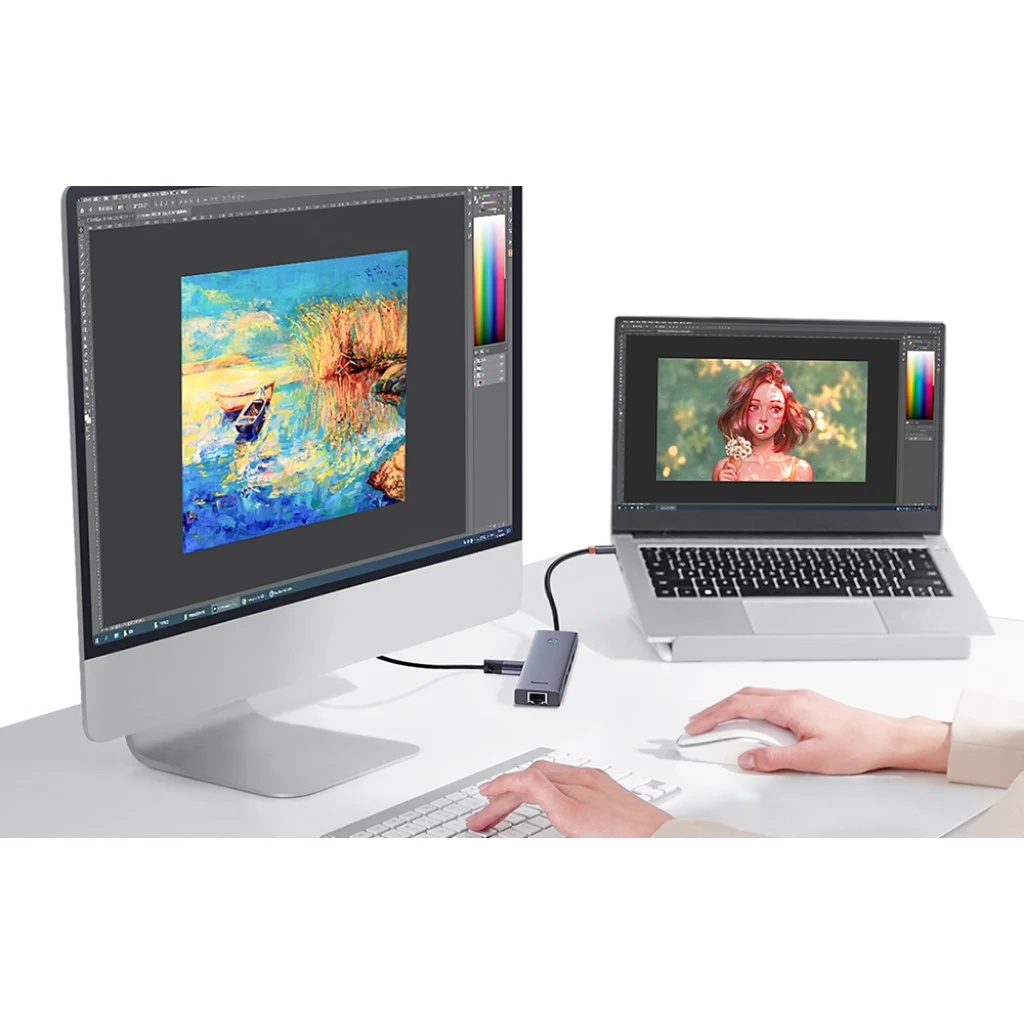 Gyakran másol fájlokat az eszközök között? A Baseus Hub megfelel az elvárásoknak! Stabil és villámgyors adatátvitelt biztosít akár 5 Gbps sebességgel. A dokkolóállomás lehetővé teszi eszközei töltését is akár 100 W-os PD-vel. Több eszköz csatlakoztatása lehetséges, például egér, billentyűzet, táblagép, okostelefon vagy hordozható meghajtó. A HDMI-port kiváló képminőséget kínál 4K@30Hz felbontással. A Hub Ethernet portja gyors és stabil internetkapcsolatot biztosít, így zökkenőmentesen filmezhet vagy játszhat.