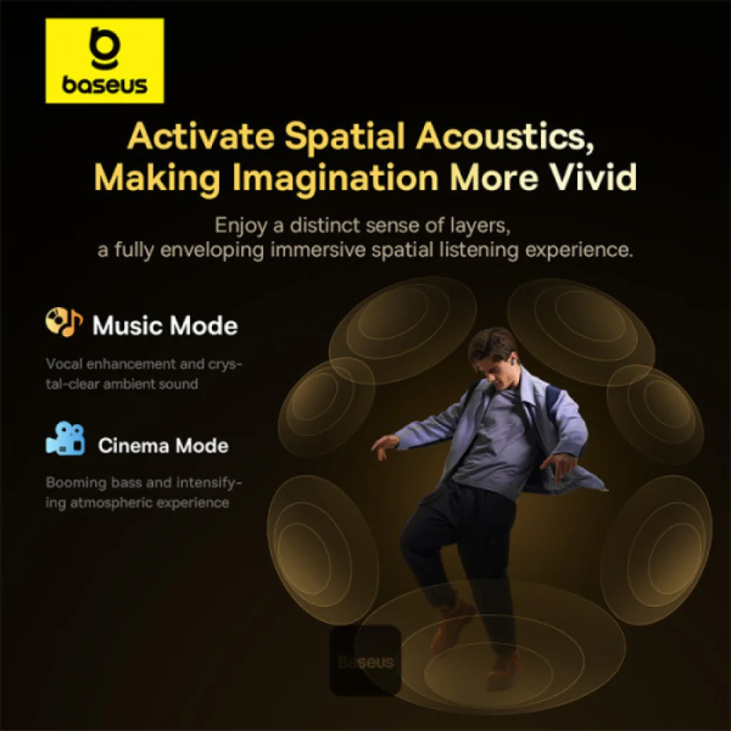 - Baseus térbeli akusztika: Szélesebb hangszínpad és magával ragadó, rétegzett hangélmény, Zene és Mozi módokkal.