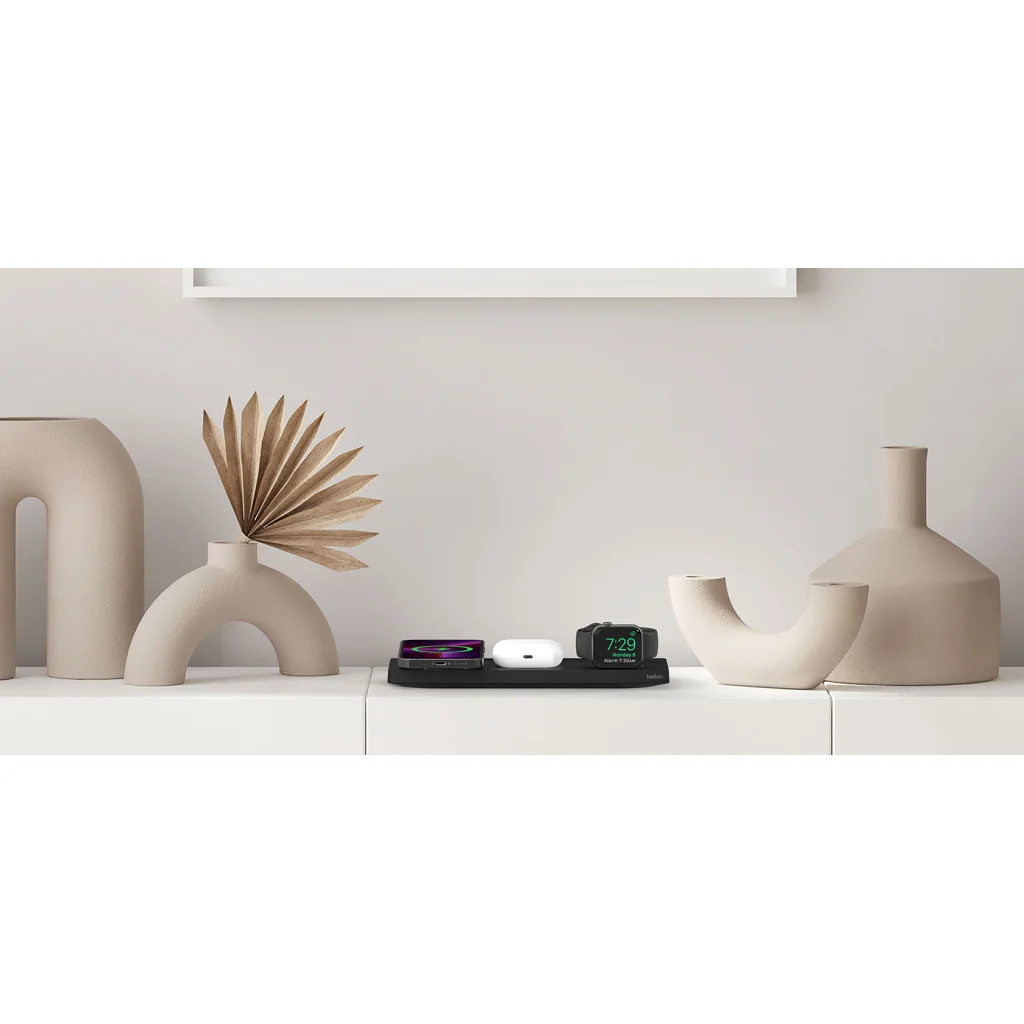 Gondolja át újra, hol és hogyan tölt ezzel a dizájnos 3 az 1-ben energiamegoldással. Akár 33%-kal gyorsabban töltheti fel az Apple Watch Series 7-et, miközben a MagSafe töltőpad gyors vezeték nélküli töltést biztosít az iPhone 14/13 és iPhone 12 modellek számára.* A modern, minimalista dizájn és a lapos dizájn bárhol elfér, és mindenhol jól mutat.