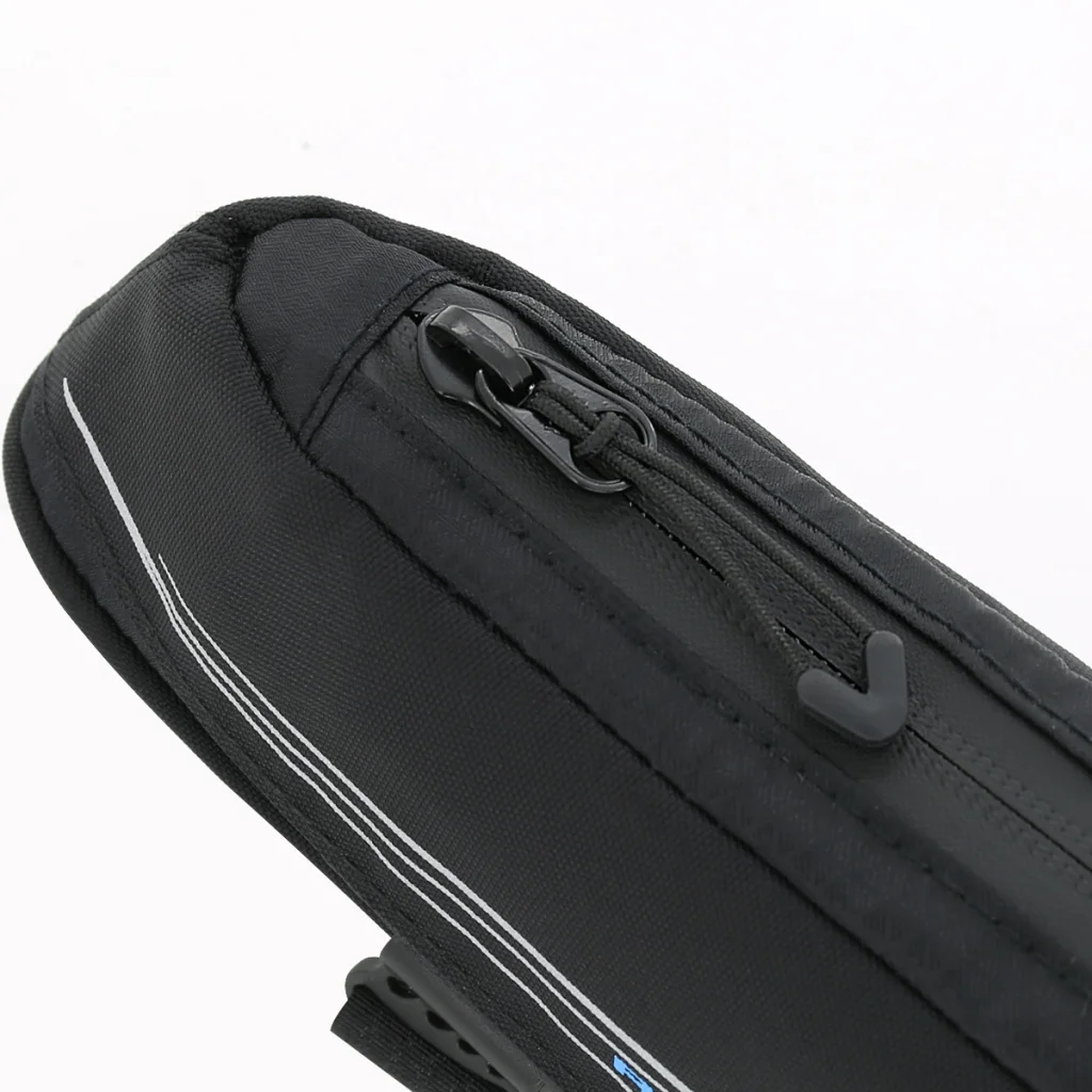 Vízálló kerékpártáska. Ez egy funkcionális cipzáras huzat, amelyet a kerékpár kormányára való szerelésre terveztek. Lehetővé teszi a tartozékok, kerékpár-eszközök és okostelefon biztonságos szállítását.