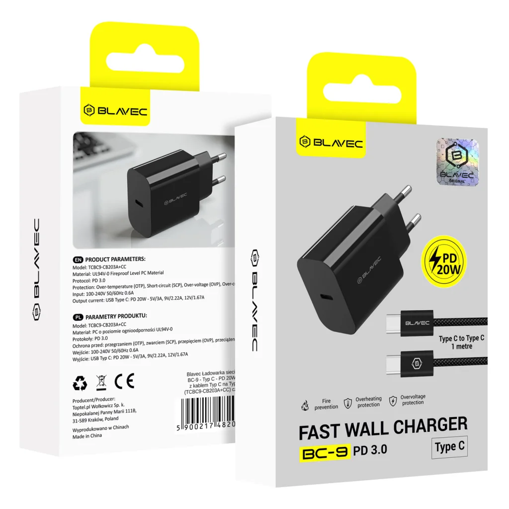 Fedezze fel a Blavec BC-9 fali töltő és a hozzá tartozó Type C - Type C kábel prémium minőségű kombinációját, amely villámgyors és biztonságos töltést biztosít modern eszközeinek. Ez a kompakt, elegáns fekete töltőadapter 20W Power Delivery (PD 3.0) technológiával van felszerelve, így pillanatok alatt feltöltheti okostelefonját, táblagépét vagy más Type C porttal rendelkező készülékét.