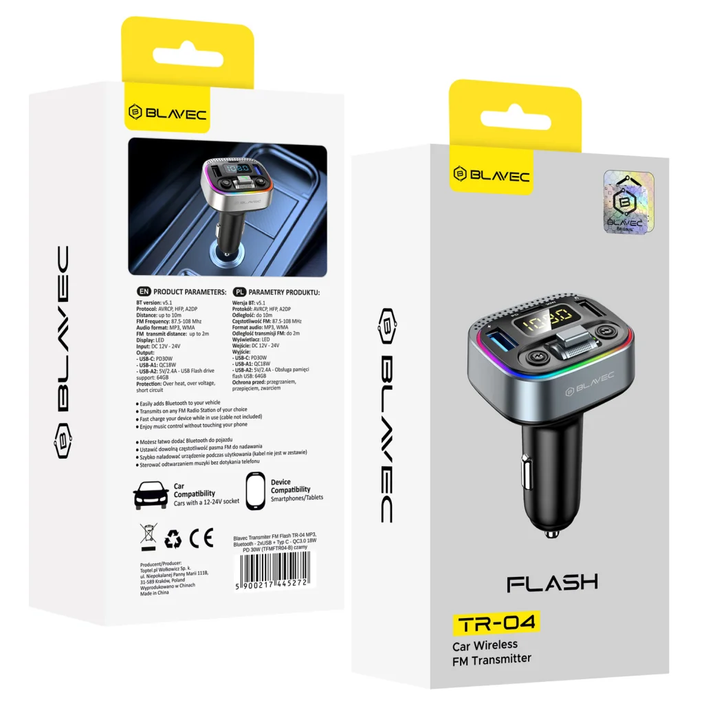 A Blavec TR-04 Flash egy modern és sokoldalú autós FM adó, amelyet a stílusos megjelenés, a prémium hangélmény és az ultragyors töltési lehetőségek szem előtt tartásával terveztek. Fekete színével, elegáns fémhatású borításával és dinamikus RGB hangulatvilágításával nem csupán egy eszköz, hanem az autód belső terének kiegészítője. Élvezd a zökkenőmentes vezeték nélküli zenehallgatást, a kristálytiszta kihangosított hívásokat, és töltsd eszközeidet villámgyorsan, mindezt egy kompakt és intuitív készülékkel.