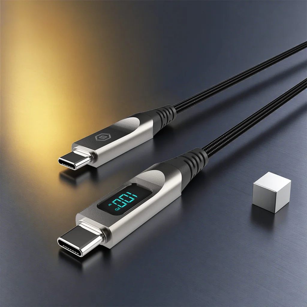 - Megerősített végek – Rugalmas TPE és ABS húzáscsökkentők védik a kábelt a legterheltebb területeken.