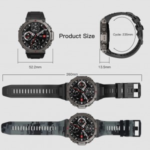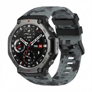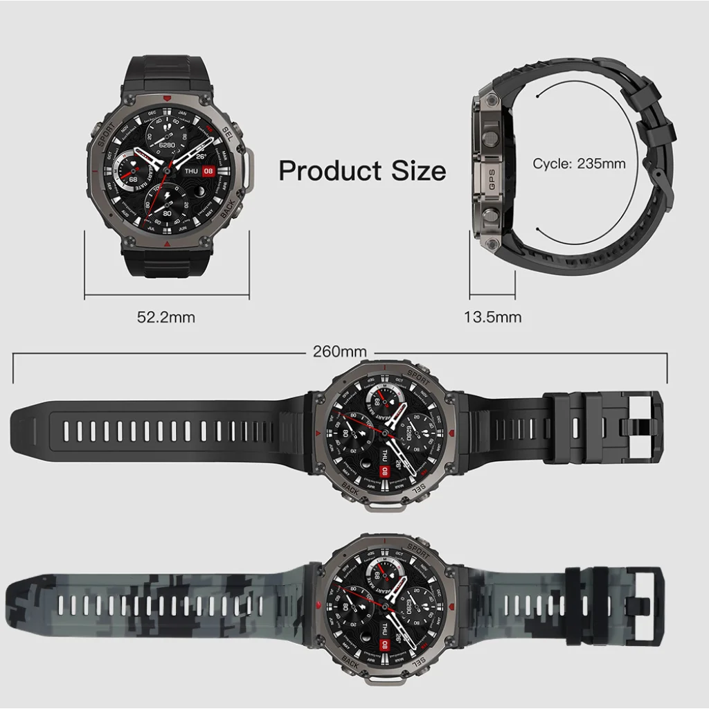 - Kényelmes, cserélhető szíjak: A standard 22 mm-es rugós rögzítésű szilikon szíj (grafit színben + 1 extra szíj, mely a képeken látható terepmintás változat is lehet) gyorsan és egyszerűen cserélhető más stílusokra, így mindig az alkalomhoz illő megjelenést választhatja. A szíj és óratok együttes hossza 260 mm, maximális csuklókerülete 235 mm.