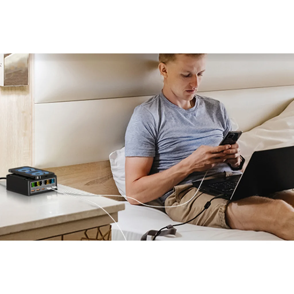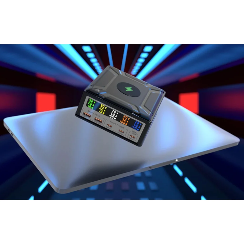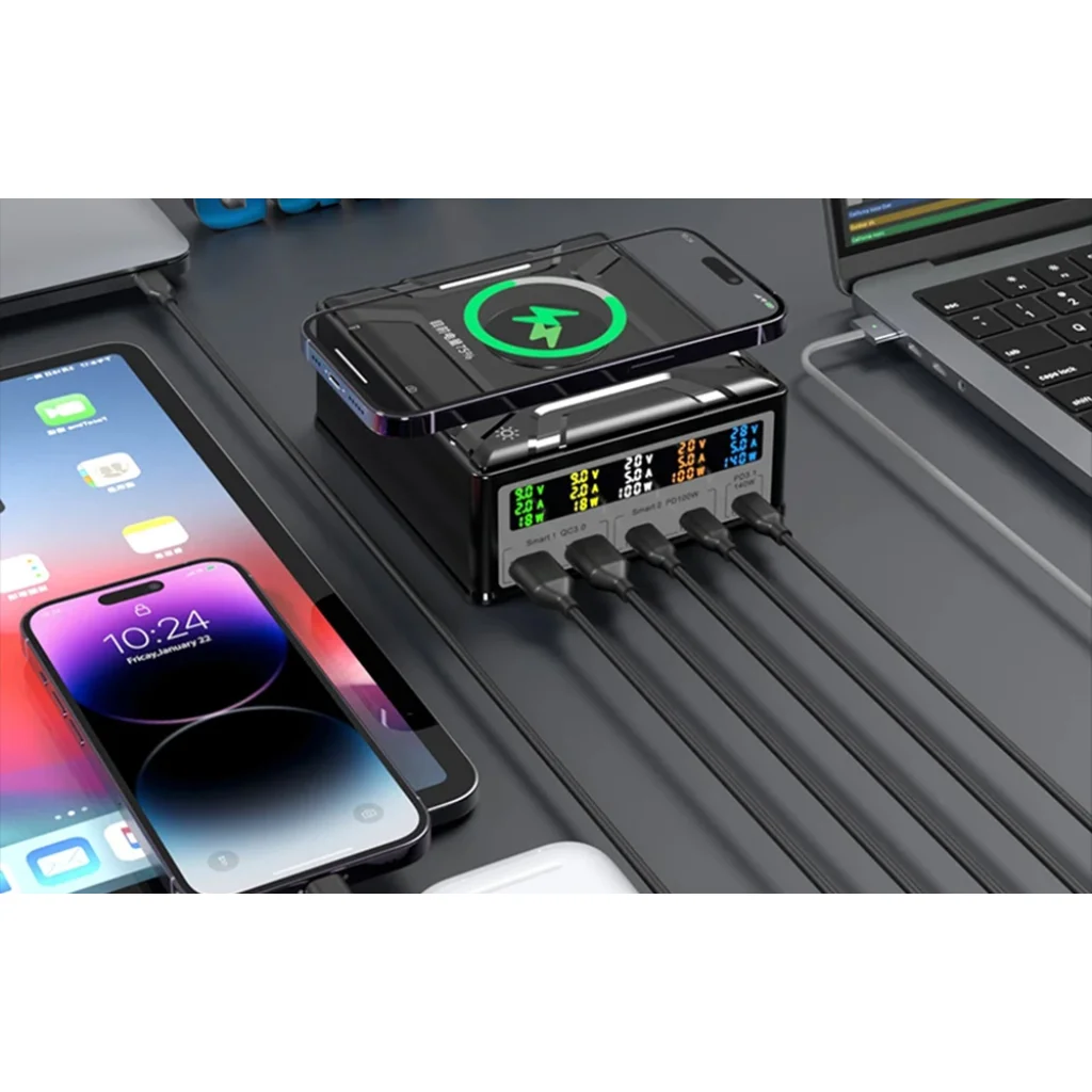 Kimenet: USB-C1: PD3.1 5 V / 3 A, 9 V / 3 A, 12 V / 3 A, 15 V / 3 A, 20 V / 5 A, 28 V / 5 A / PPS: 3,3-21 V / 5 A, 140 W (Max.); USB-C2 / USB-C3: PD3.0 5 V / 3 A, 9 V / 3 A, 12 V / 3 A, 15 V / 3 A, 20 V / 5 A / PPS: 3,3-21 V / 5 A, 100 W (Max.); USB-C2 + USB-C3: 45 W + 45 W; USB-A1 / USB-A2: QC3.0 5 V / 3 A, 9 V / 2 A, 12 V / 1,5 A, 4,5 V / 5 A, 5 V / 4,5 A 22,5 W (Max.); USB-A1 + USB-A2: 12 W + 12 W; vezeték nélküli töltés: 15 WATT / 10 WATT / 7,5 WATT / 5 WATT;