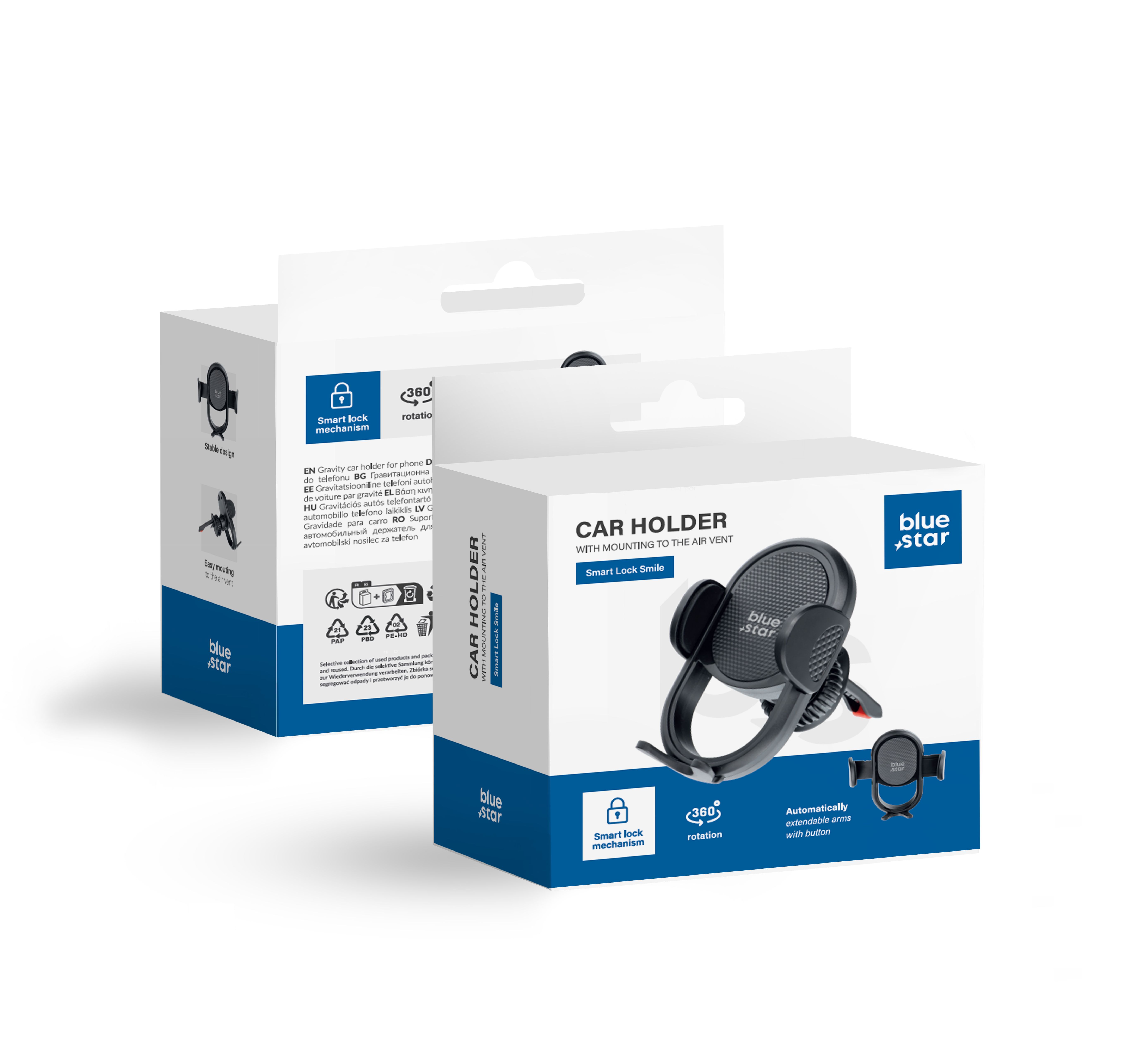 A BLUE STAR SMART LOCK SMILE gravitációs autós tartó innovatív megoldás, amely lehetővé teszi, hogy biztonságosan és stabilan rögzítse okostelefonját a vezető látóterében. A légbeömlő rácsra tervezett tartót rendkívül egyszerű használni az intelligens Smart Lock mechanizmusnak köszönhetően. Ennek a modellnek a jellegzetes eleme a Smart Lock rendszer, amely automatikusan a készülék méretéhez igazítja a tartó karjait, biztosítva annak erős és stabil tartását. Továbbá, a tartó lehetővé teszi a könnyű 360 fokos forgatást egy forgatásmechanizmus zárral, így kényelmesen elhelyezheti a telefont mind függőleges, mind vízszintes helyzetben. A tartó kialakítása esztétikus és modern megjelenésével tűnik ki, amely nemcsak funkcionális kiegészítő, hanem stílusos eleme is az autó belső terének. Az egyszerű rögzítési rendszer a légbeömlő rácsra gyors és problémamentes telepítést garantál, további eszközök nélkül. Specifikáció: