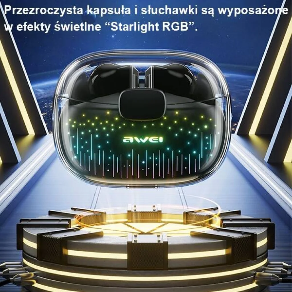 A fülhallgató futurisztikus dizájnt kínál, amely magával ragadó vizuális élményt nyújt. Az átlátszó kapszula "Starlight RGB" világítási effektekkel van felszerelve.