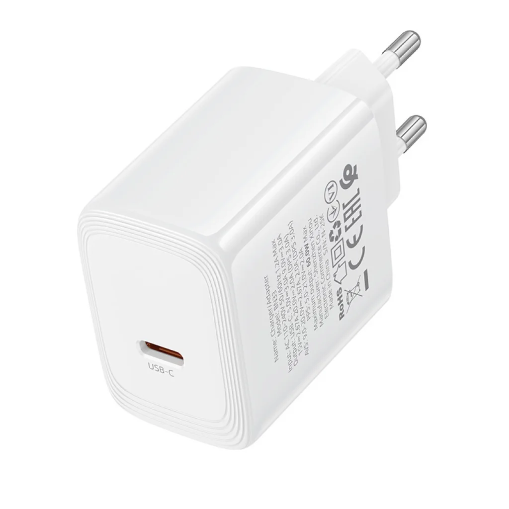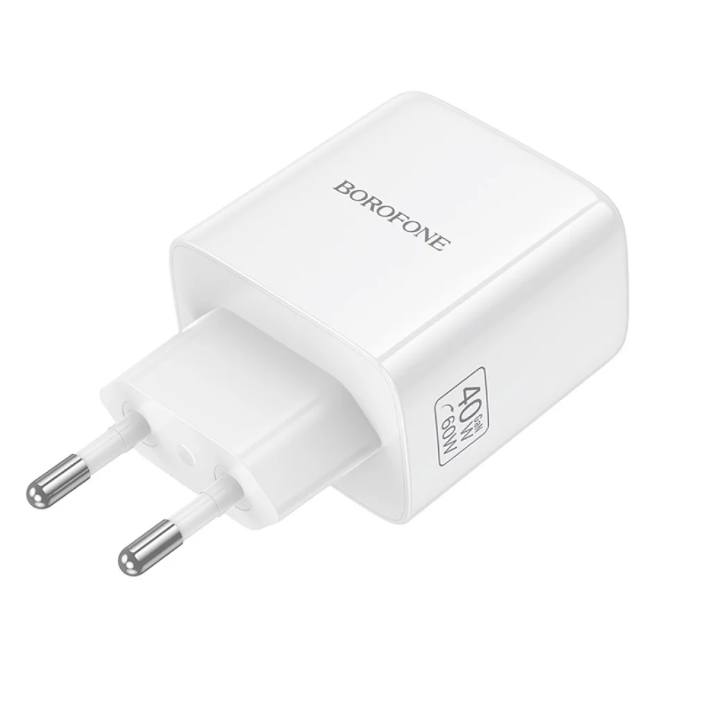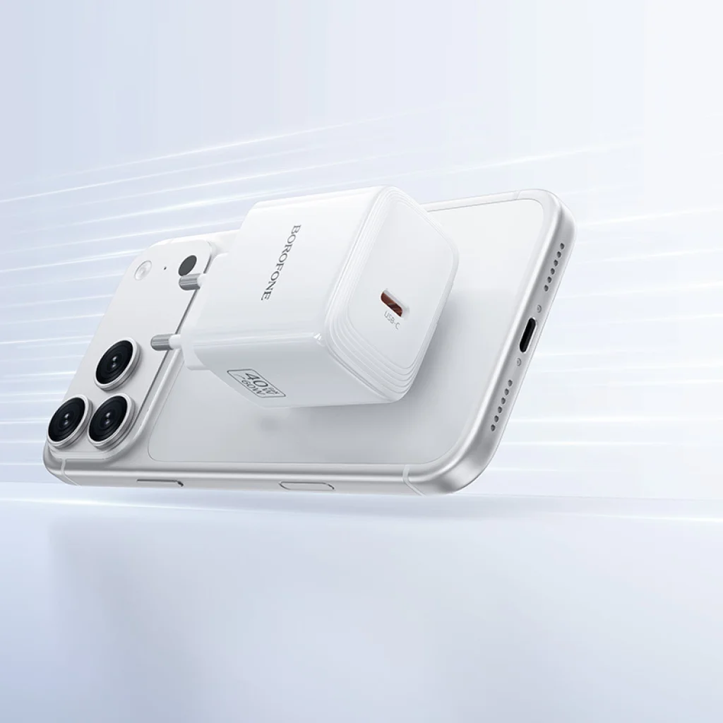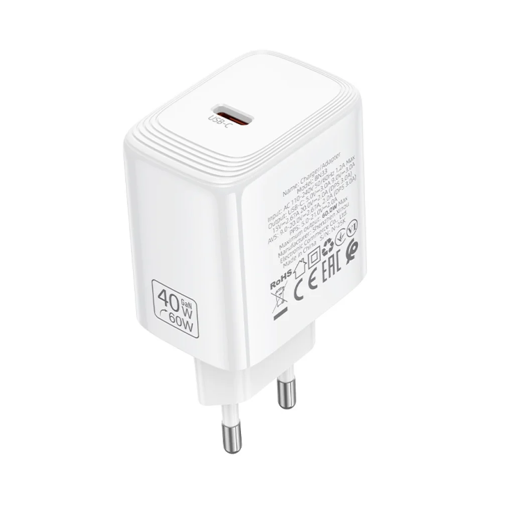A Borofone BN33 Fuente GaN Type-C - QC3.0 PD 40W egy kompakt és hatékony fali töltő, amely gyors töltést tesz lehetővé PD 3.2, AVS, PPS, és QC 3.0 támogatással. A modern GaN technológiának köszönhetően magas teljesítményt nyújt, miközben megőrzi kompakt méretét. Gyakorlati megoldást kínál a mindennapi okostelefonok, táblagépek és más mobil eszközök töltésére.
