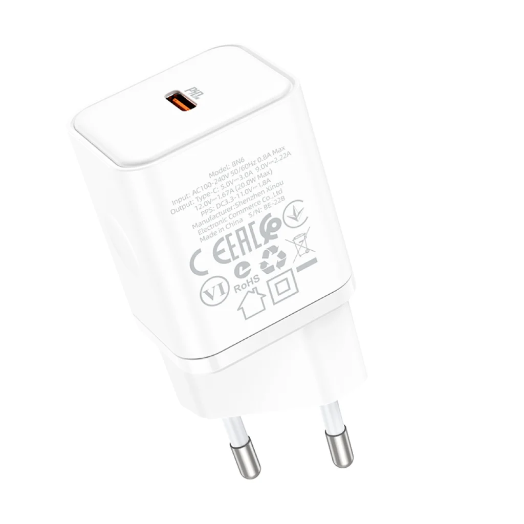Fedezze fel a Borofone BN6 hálózati töltő adaptert, amely a modern okostelefonok, tabletek és egyéb Type-C csatlakozós eszközök gyors és hatékony töltésére készült. Ez a kompakt, elegáns fehér adapter ideális választás otthoni, irodai használatra és utazáshoz egyaránt, köszönhetően a fejlett gyorstöltési technológiáknak és a rendkívül praktikus, mini méretének.