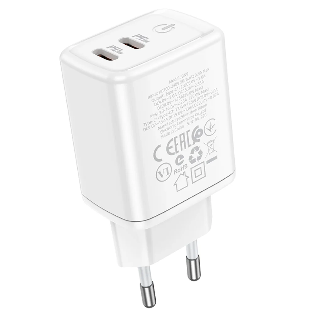 Borofone BN9 Reacher hálózati töltő adapter 2xType C QC 3.0 PD 35W fehér