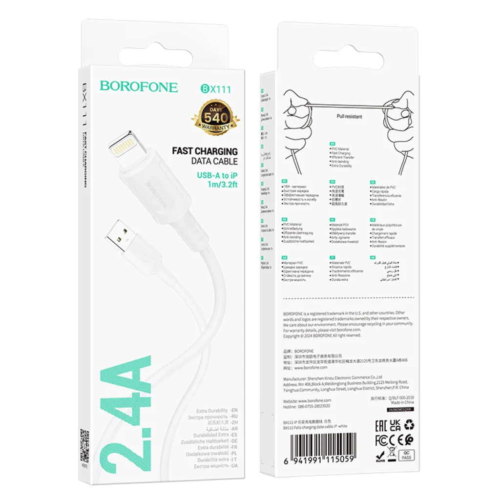 Borofone Cable BX111 Feliz - USB to Lightning - 2,4A 1 méter fehér