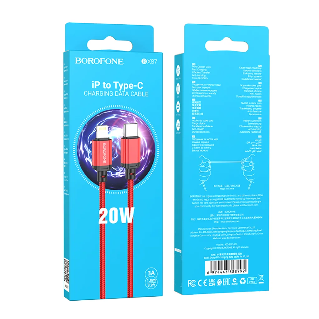 Borofone Cable BX87 Sharp - Type C to Lightning - PD 20W 1 méter piros