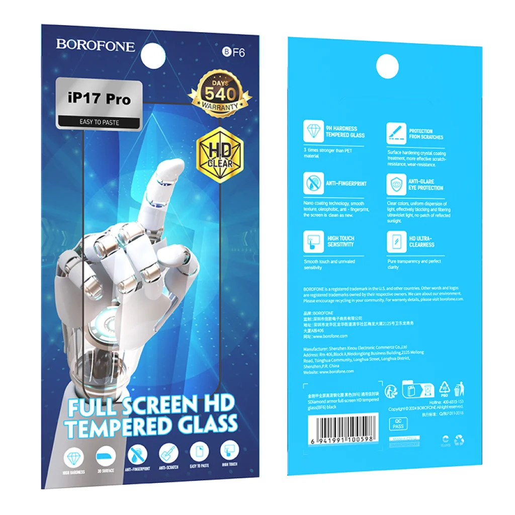 A Borofone Edzett üveg BF6 Diamond Armor Teljes Képernyős HD iPhone 17 Pro Max – 10 darabos csomag egy kiváló minőségű teljes fedésű képernyővédő, amely nagyszerű tisztaságot és megbízható védelmet nyújt. 0,3 mm-es magas alumínium-oxid üvegből készült, erős tartósságot biztosít, miközben megőrzi a magas fényáteresztést, amely körülbelül 90–92%. A sima, oleofób felület csökkenti az ujjlenyomatokat, olajfoltokat, és megkönnyíti a tisztítást. Tökéletes választás javítóműhelyek vagy azok számára, akik hosszú távú készletet szeretnének a képernyővédőkből. -Anyag: 0,3 mm magas alumínium-oxid üveg – tartós, kemény üveg a mindennapi képernyővédelemhez