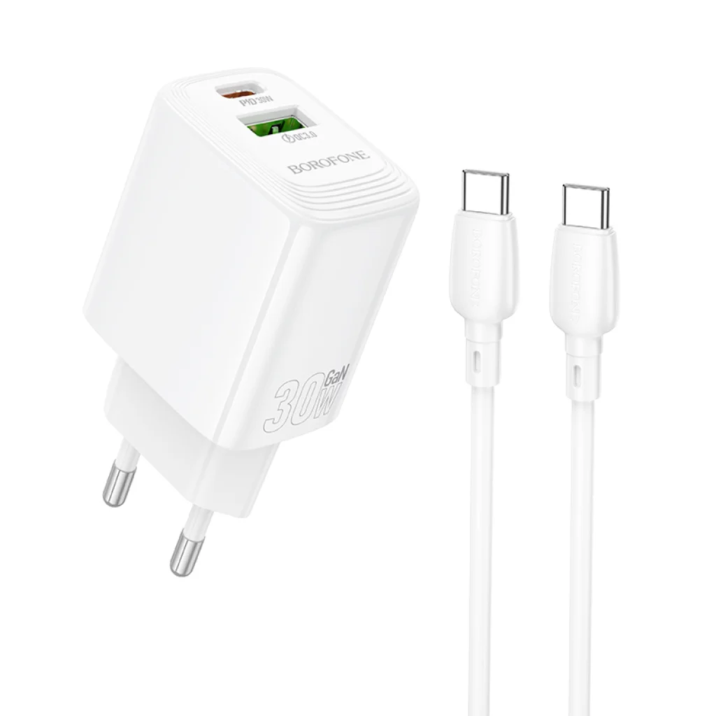 Borofone BN29 GaN fali töltő 30W, USB-C + USB-A portokkal, Type-C kábellel