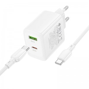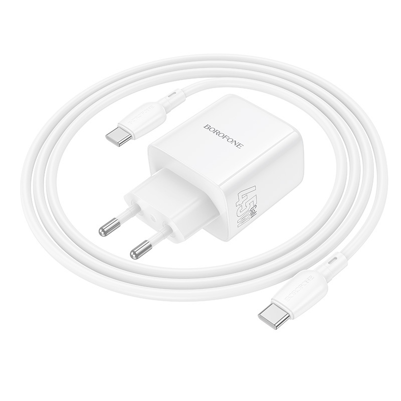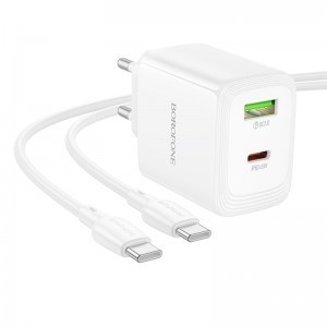 A Borofone fali töltő BN30 Cargador GaN – USB + Type-C – QC 3.0 PD 45W Type-C to Type-C kábellel – fehér egy erőteljes és kompakt GaN alapú gyorstöltő szett, amelyet több eszköz biztonságos és hatékony töltésére terveztek. A töltő USB-C és USB-A portokkal rendelkezik, amelyek támogatják a PD, QC, FCP és AFC protokollokat, összesen akár 45W teljesítmény leadására képes. Tűzálló PC anyagból készült a fokozott biztonság érdekében, és könnyedén ellátja energiával az okostelefonokat, táblagépeket és laptopokat. A szett tartalmaz egy 1 m-es USB-C to USB-C 60W kábelt az azonnali használathoz.