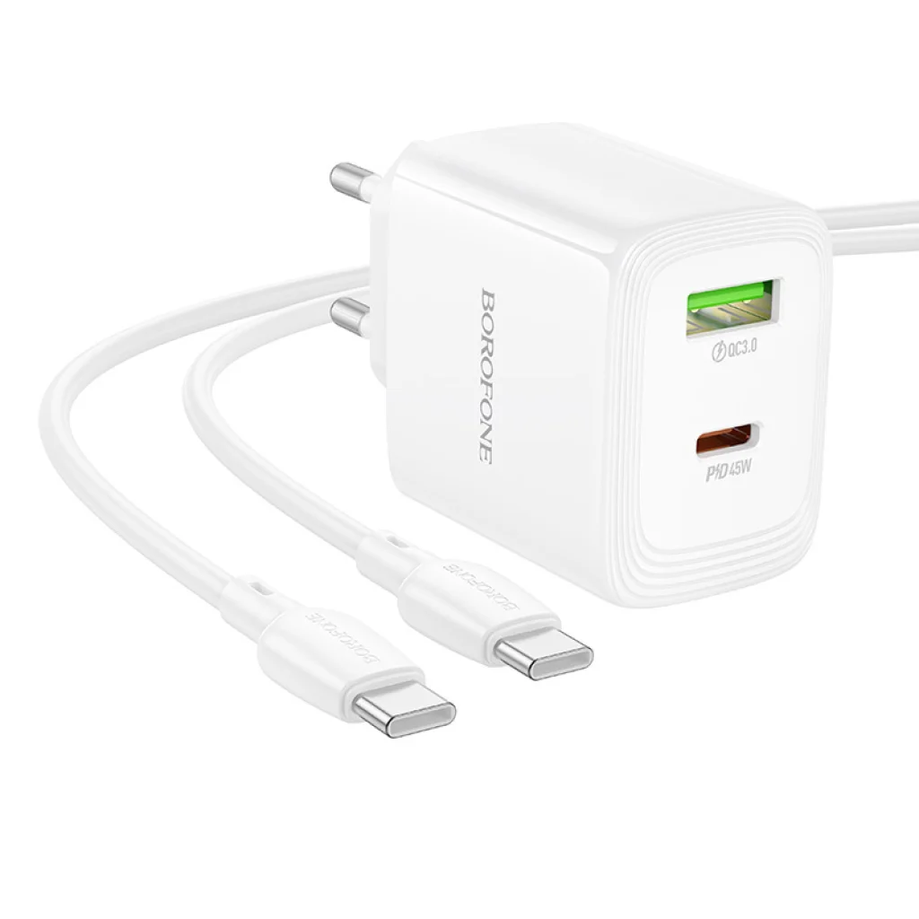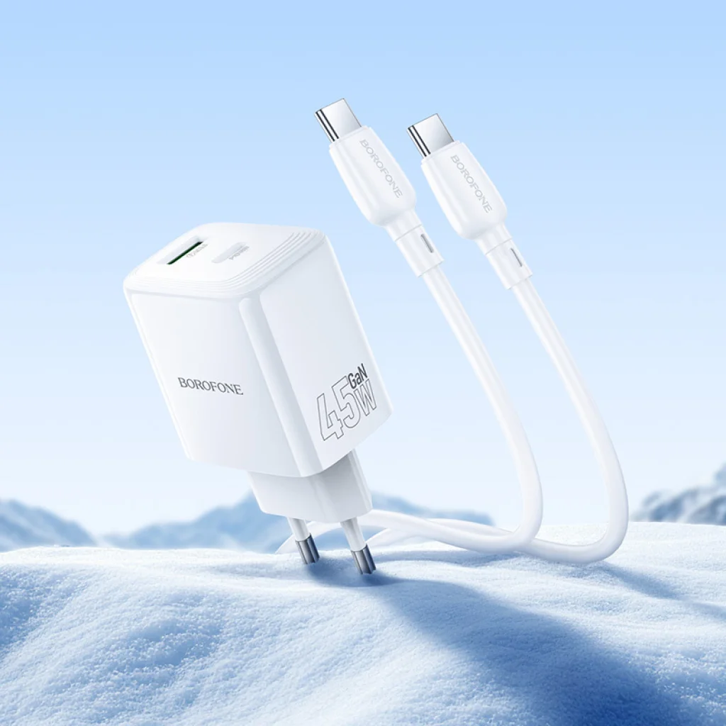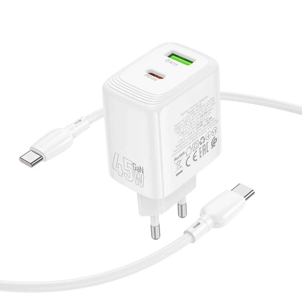 - Termék neve: Borofone BN30 Cargador GaN fali töltő - USB + Type C - QC 3.0 PD 45W Type C to Type C kábellel fehér