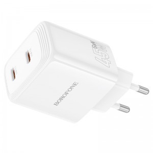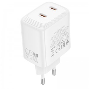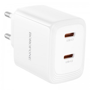 A Borofone fali töltő BN31 Cargador GaN – 2x Type-C – QC 3.0 PD 45W – fehér egy kompakt és hatékony, új generációs GaN töltő, amely gyors és biztonságos két eszköz egyidejű töltésére szolgál. Két USB-C porttal van felszerelve, amelyek támogatják a PD, QC, FCP és AFC gyorstöltési protokollokat, és akár 45W összteljesítményt is nyújtanak, ideális okostelefonokhoz, táblagépekhez és laptopokhoz. Tűzálló PC anyagból készült, biztosítva a biztonságot, tartósságot és a hosszú távú megbízhatóságot. - Anyag: tűzálló PC borítás - Kimenet: USB-C1/C2: 45W (PD/QC/FCP/AFC) - Kombináció: USB-C1 + USB-C2: 25W + 20W - Csatlakozó típusa: EU - Méret: 83 × 45 × 31 mm; súly: 125 g