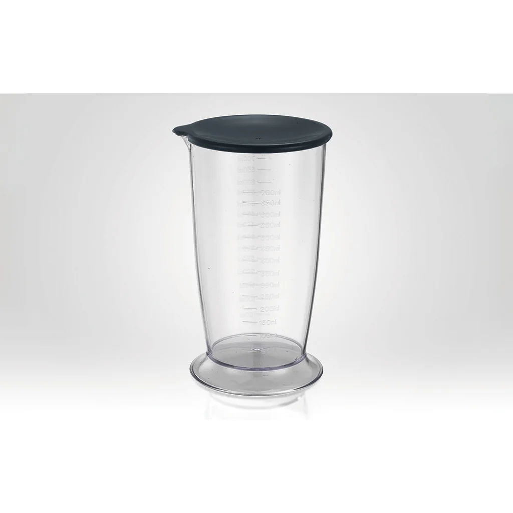 Egy 700 ml-es mérőedényt találsz, amely megkönnyíti a hozzávalók mérését és turmixolását. A fedél lehetővé teszi a kész étel tárolását anélkül, hogy másik edénybe kellene önteni, ami tovább növeli a mixer funkcionalitását.