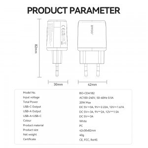 Ez a töltő két porttal van ellátva — USB-C és USB-A — ami lehetővé teszi akár két eszköz egyidejű gyorstöltését. Az USB-C port támogatja a PD töltési protokollt, és maximum 20W teljesítményt nyújt, ha önállóan használják, míg az USB-A port a QC technológiára épül, és akár 18W teljesítményt biztosít. Ha mindkét port egyszerre van használatban, a töltő még mindig 18W gyorstöltést kínál, ezáltal két eszköz egyidejű töltését is lehetővé téve. A készülékház lángálló PC anyagból készült, ellenáll a magas hőmérsékleteknek és az ütődéseknek, így a töltő biztonságos és tartós. A beépített intelligens chip automatikusan érzékeli az áramerősséget és a feszültséget, ezzel védve az eszköz akkumulátorát a sérülésektől. A tervezés összesen nyolc szintű védelmet biztosít, ideértve a túlfeszültség, túláram, túlzott kisütés, rövidzárlat, túlterhelés, túlmelegedés, akkumulátor károsodás, és túlságosan nagy áramerősség elleni védelmet. Továbbá, a beépített intelligens transzformátor biztosítja a stabil feszültséget és áramot, garantálva a biztonságos töltést bármilyen helyzetben.