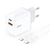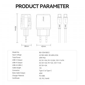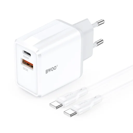 A gyors töltő két porttal van felszerelve — USB-C és USB-A — lehetővé téve két eszköz egyidejű gyors töltését. Az USB-C port támogatja a PD protokollt, és maximális 20W teljesítményt ér el, amikor önállóan működik, míg az USB-A port QC technológiát támogat, akár 18W teljesítménnyel. Amikor mindkét portot egyszerre használják, a töltő még mindig gyors töltést biztosít 18W-on, lehetővé téve két eszköz egyidejű töltését. A csomag tartalmaz egy USB-C - USB-C kábelt, amely támogatja a 65W teljesítményű PD töltést, így ez a termék még praktikusabb és azonnali használatra kész. A töltő háza lángnemesített PC anyagból készült, amely ellenáll a magas hőmérsékleteknek és a leeséseknek, biztosítva a tartósságot és a biztonságot. A beépített intelligens chip automatikusan felismeri az aktuális intenzitást és feszültséget, védve az eszköz akkumulátorát a károsodástól. Az eszköz nyolc szintű védelmet kínál, beleértve a túlfeszültség, túlképzés, túltöltés, rövidzárlat, túlterhelés, túlhevülés, akkumulátor károsodás és túlképzési védelem. Ezen kívül a beépített okos transzformátor biztosítja a stabil feszültséget és áramot, biztonságos és megbízható töltést biztosítva bármely helyzetben.