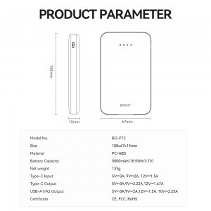 - Biztonság mindenekelőtt: A BWOO P72 beépített védelmi rendszere túltöltés, túlkisülés és rövidzárlat ellen is óvja eszközeit. A CE, FCC és RoHS tanúsítványok garantálják a termék biztonságos és környezetbarát működését.