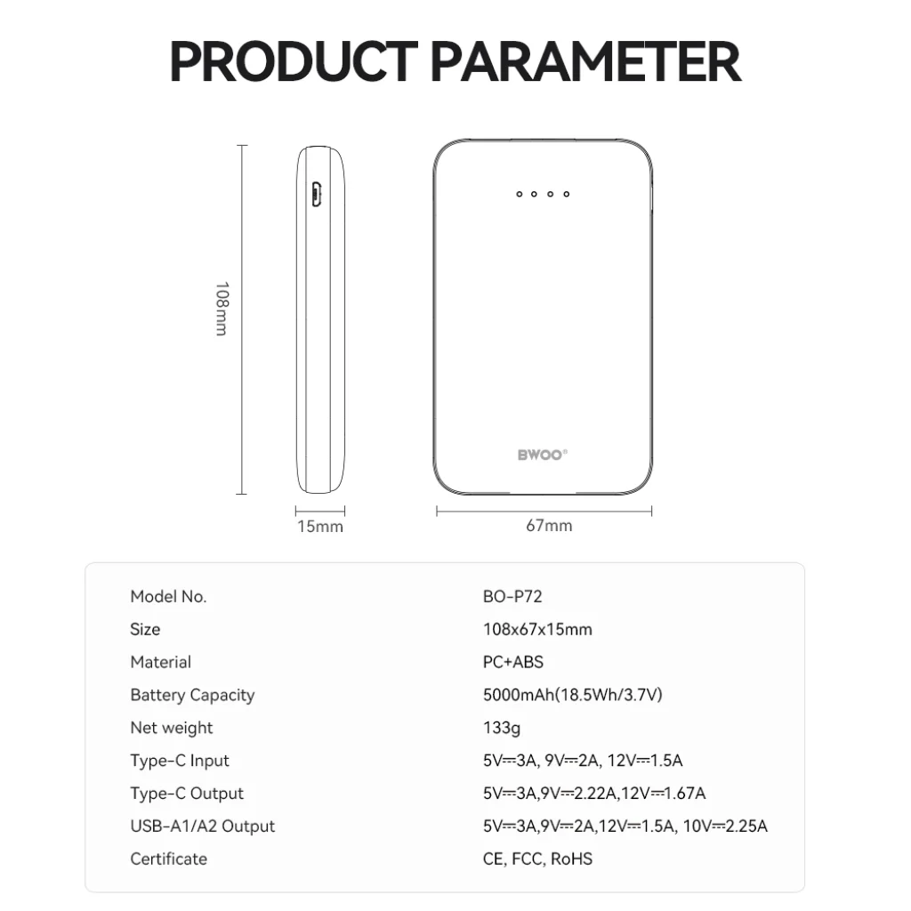 - Biztonság mindenekelőtt: A BWOO P72 beépített védelmi rendszere túltöltés, túlkisülés és rövidzárlat ellen is óvja eszközeit. A CE, FCC és RoHS tanúsítványok garantálják a termék biztonságos és környezetbarát működését.