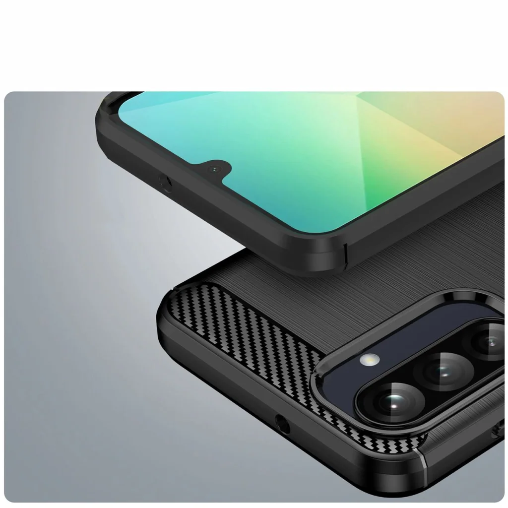 Carbon tok Samsung Galaxy A26 - fekete A Carbon tok a Samsung Galaxy A26 számára tökéletes kombinációja a stílusnak, védelemnek és funkcionalitásnak, amely még a legigényesebb felhasználók elvárásainak is megfelel. Emelt széleinek köszönhetően páratlan védelmet nyújt mind a képernyő, mind a kamera lencséi számára, minimalizálva a karcolások és sérülések kockázatát. Precíz kivágások biztosítják a könnyű hozzáférést az összes porthoz és funkcióhoz, míg az integrált gombok megvédik azokat a portól és szennyeződéstől. A tökéletes illeszkedés révén a tok tökéletesen simul a telefonra, kiemelve annak karcsú sziluettjét. Kényelmes, csúszásmentes kialakítása biztos fogást és kényelmet nyújt a mindennapi használat során.