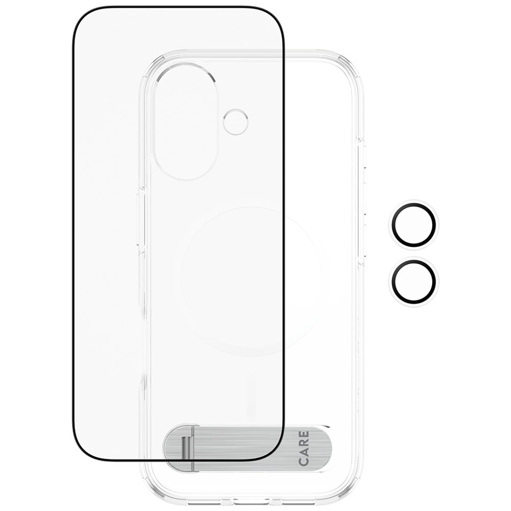 CARE by PanzerGlass Feature Kick 3 az 1-ben iPhone védelmi készlet. A teljes csomag védelem és kényelem. A CARE by PanzerGlass® 3 az 1-ben iPhone 17 tok a tökéletes megoldás azok számára, akik nemcsak biztonságot, hanem praktikusságot és eleganciát is várnak el. A készlet tartalmaz egy Ultra-Wide Fit képernyővédőt, amely 60%-ban újrahasznosított üvegből készült, és teljes védelmet nyújt a képernyőnek a karcolások és ütődések ellen, miközben megőrzi a képernyő tisztaságát és érintésérzékenységét. A telepítés rendkívül egyszerű a mellékelt EasyAligner eszköznek köszönhetően, amely garantálja a tökéletes illeszkedést elsőre. Kamera védelem és sokoldalú tok: A tiszta Hoops® lencsevédő megőrzi a kamera eredeti állapotát, védelmet nyújtva a karcolások és sérülések ellen, anélkül hogy rontaná a fotók és videók élességét. Az egyedi MagSafe tok kitámasztóval, amelyet akár 4,8 méter magasról történő ejtési tesztekkel teszteltek, kiegészíti a csomagot. A vékony, könnyű kialakítás, amely 100% újrahasznosított anyagból készült, nemcsak védi a telefont, hanem kényelmes 360°-os kitámasztót is kínál a kényelmes filmezéshez, videóhíváshoz vagy kihangosított használathoz. Stílusos, környezetbarát választás. A 3 az 1-ben terméket a fenntarthatóság és tartósság jegyében tervezték. A tok újrahasznosított műanyagból, újrahasznosított üvegből és FSC™-minősített papírcsomagolásból készült, garantálva a felelős választást. A termék megfelel a Global Recycled Standard (GRS) követelményeinek, biztosítva a teljes átláthatóságot a gyártási folyamat során. Ezenkívül a tok egyéves sárgulás elleni garanciával rendelkezik, biztosítva, hogy az iPhone hosszú ideig megőrizze friss és elegáns megjelenését. Ez a megoldás a legmagasabb szintű védelmet kombinálja a bolygó iránti gondoskodással. Technikai adatok Márka: PanzerGlass Célkészülék: Apple iPhone Mi van a dobozban? CARE by PanzerGlass Feature Kick 3 az 1-ben iPhone védelmi készlet.