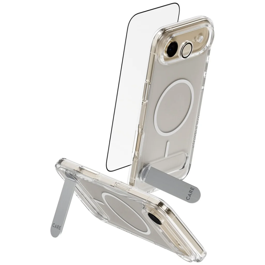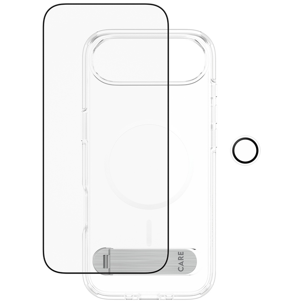 CARE by PanzerGlass Feature Kick 3-in-1 iPhone védelmi készlet. A teljes körű védelem és kényelem csomagja. A CARE by PanzerGlass® 3-in-1 iPhone 17 tok tökéletes megoldás azok számára, akik nemcsak biztonságot, hanem praktikusságot és eleganciát is elvárnak. A készlet tartalmaz egy ultra széles üvegfóliát, amely 60% újrahasznosított üvegből készült, és megvédi az egész képernyőt a karcolásoktól és ütések ellen, miközben teljes tisztaságot és érintésérzékenységet biztosít. A telepítés rendkívül egyszerű a mellékelt EasyAligner eszköznek köszönhetően, amely garantálja a tökéletes illeszkedést már elsőre. A kamera védelme és sokoldalú tok biztosított. A tiszta Hoops® lencsevédő fenntartja a kamera eredeti állapotát, megóvva azt a karcolásoktól és károktól, anélkül, hogy a fotók és videók élességét befolyásolná. Az egyedi MagSafe tok támasztóval, amely akár 4,8 méteres eséspróbának is ellenáll, kiegészíti a csomagot. A karcsú, könnyű kialakítás, amely 100% újrahasznosított anyagokból készült, nemcsak a telefon védelmét biztosítja, hanem kényelmes 360°-os támasztót is kínál a kényelmes filmnézéshez, videohívásokhoz vagy kihangosított használathoz. Stílusos, környezetbarát választás. A 3 az 1-ben terméket a fenntarthatóság és tartósság jegyében tervezték. Az újrahasznosított műanyagból, újrahasznosított üvegből és FSC™-tanúsított papírcsomagolásból készült tok felelős választást garantál. A termék megfelel a Global Recycled Standard (GRS) követelményeinek, biztosítva a termelési folyamat teljes átláthatóságát. Továbbá a tok egyéves sárgulás elleni garanciával érkezik, így iPhone-ja hosszú ideig megőrzi friss és elegáns megjelenését. Ez a megoldás a legmagasabb szintű védelmet ötvözi a bolygó iránti gondoskodással. Műszaki adatok: márka: PanzerGlass, kompatibilis telefonmodell: Apple iPhone Air. A csomag tartalma: CARE by PanzerGlass Feature Kick 3-in-1 iPhone védelmi készlet.