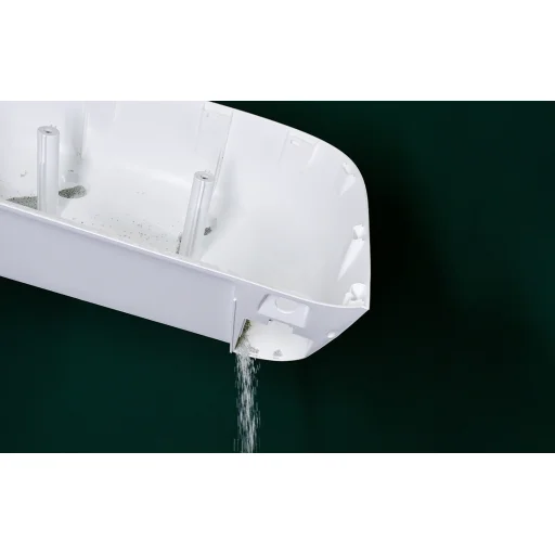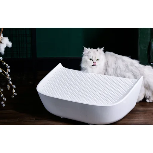 A lépcsőt magas sűrűségű rácsozattal látták el, hogy az almot, amely a macska lábáról és szőréről lehullana, a nagy belső tartályba gyűjtse, nem pedig a padlóra. A hátul elhelyezett nyílás gyors és kényelmes kiürítést tesz lehetővé.