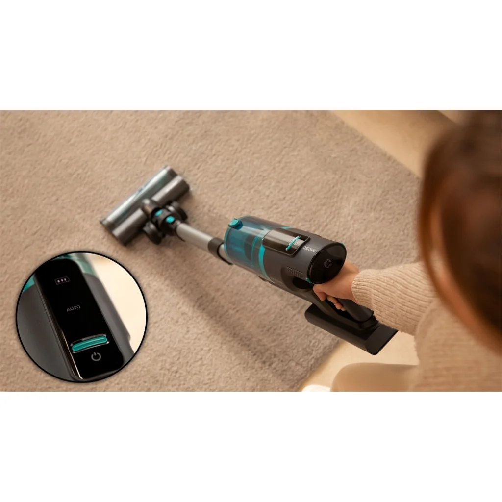 - Az automatikus üzemmód intelligensen alkalmazkodik: érzékelői segítségével a porszívó felismeri a szennyeződés mértékét és a felület típusát, automatikusan beállítva a szívóerőt. Ez nemcsak a tisztítás hatékonyságát növeli, de jelentősen meghosszabbítja az akkumulátor üzemidejét is.