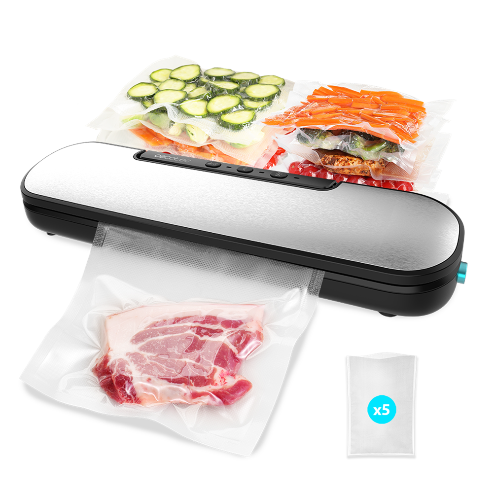A készülék 5 darab kezdő vákuumzacskóval érkezik, így már az első pillanattól kezdve kipróbálhatja a vákuumcsomagolás előnyeit, ahogy az a csatolt képen is látható.