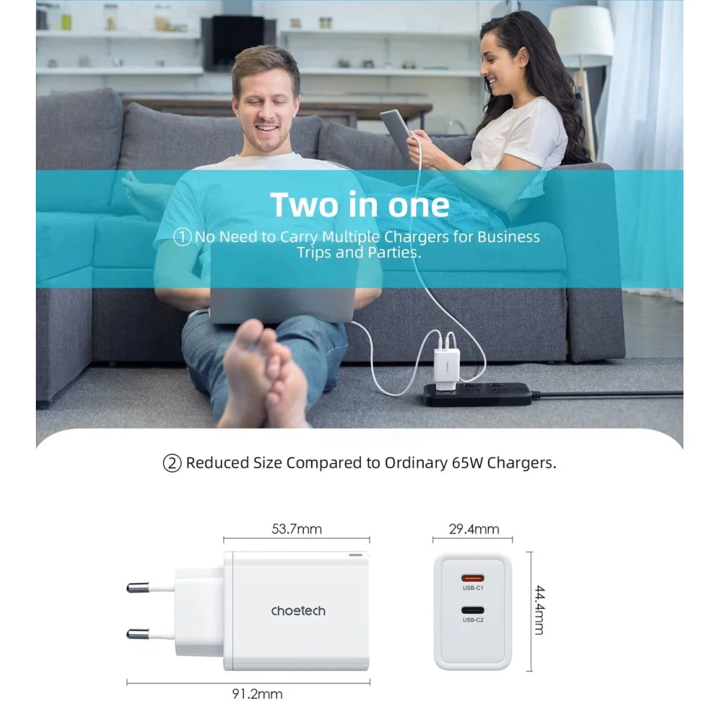 Choetech PD6013 GaN fali töltő USB-C és USB-C csatlakozókkal, 65W - fehér. A Choetech PD6013 fali töltő akár 65 W teljesítménnyel működik és két USB-C porttal rendelkezik. Lehetővé teszi két eszköz egyidejű töltését és kompakt méretű. A GaN technológia rendkívül gyors és hatékony töltést biztosít. A beépített védelem a túlmelegedés, túlfeszültség, túlterhelés vagy rövidzárlat ellen a legmagasabb szintű biztonságot nyújtja.