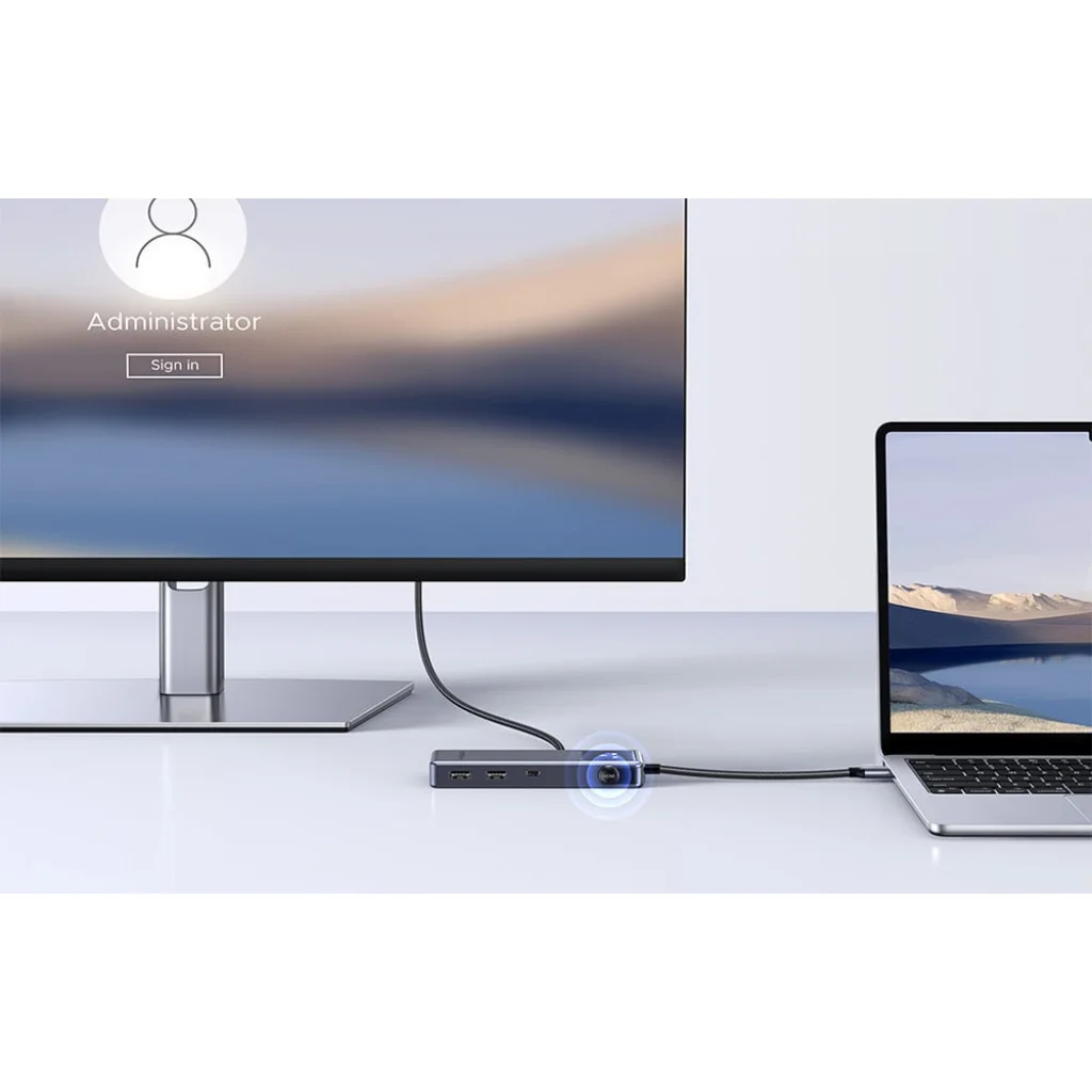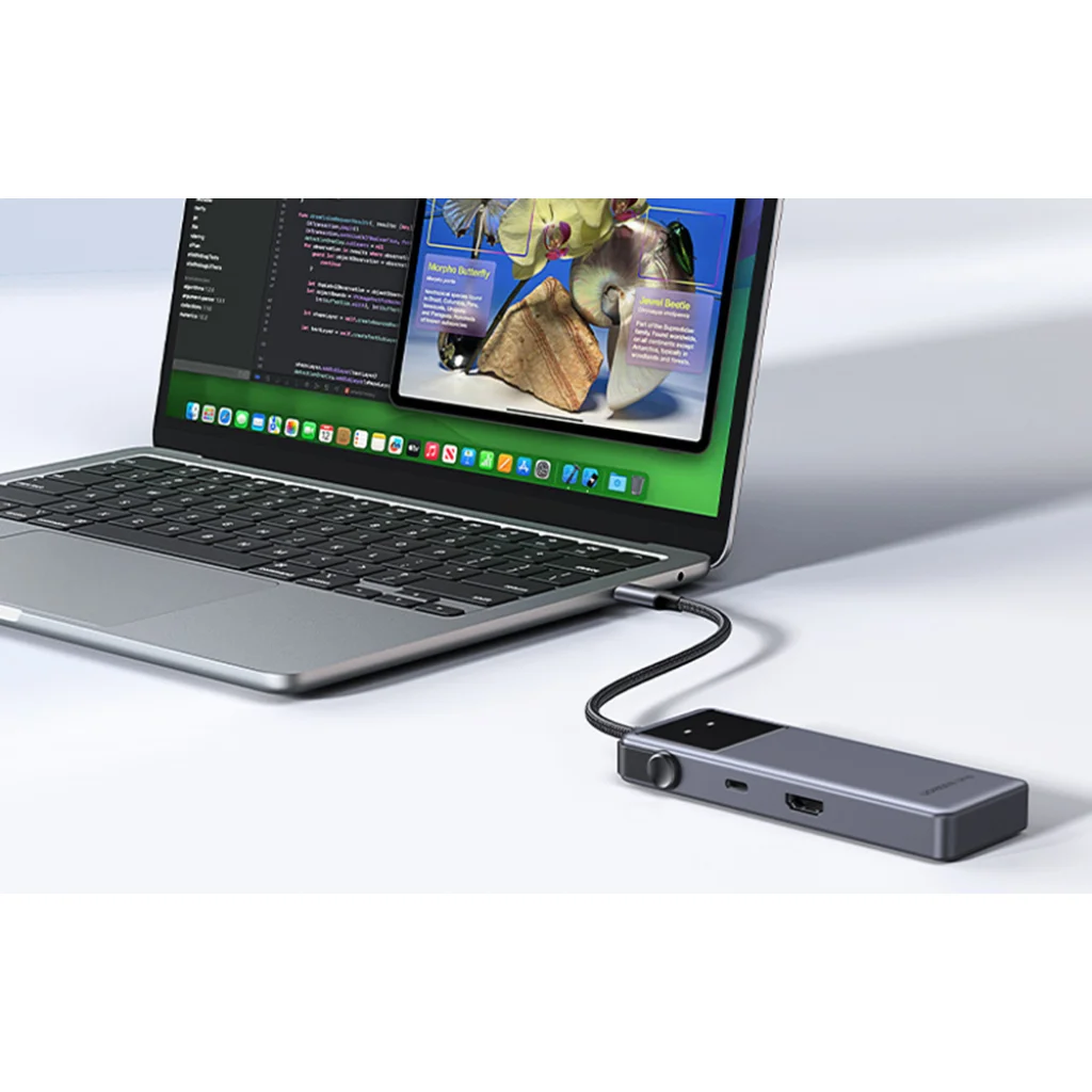 Az UGREEN CM889 hat porttal rendelkezik, amelyek lehetővé teszik több eszköz egyidejű csatlakoztatását. Ez megkönnyíti a billentyűzet, egér, flash meghajtó vagy külső meghajtó csatlakoztatását a laptophoz, valamint a monitor csatlakoztatását HDMI-n keresztül. Ez a megoldás különösen hasznos irodai munkához és korlátozott számú porttal rendelkező laptopok használatához.