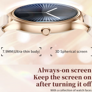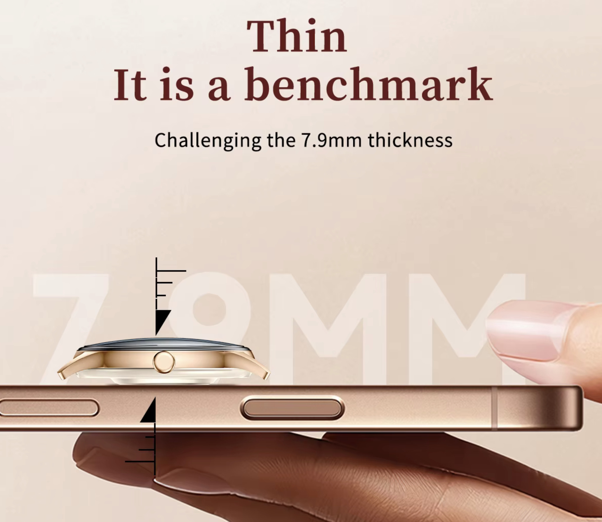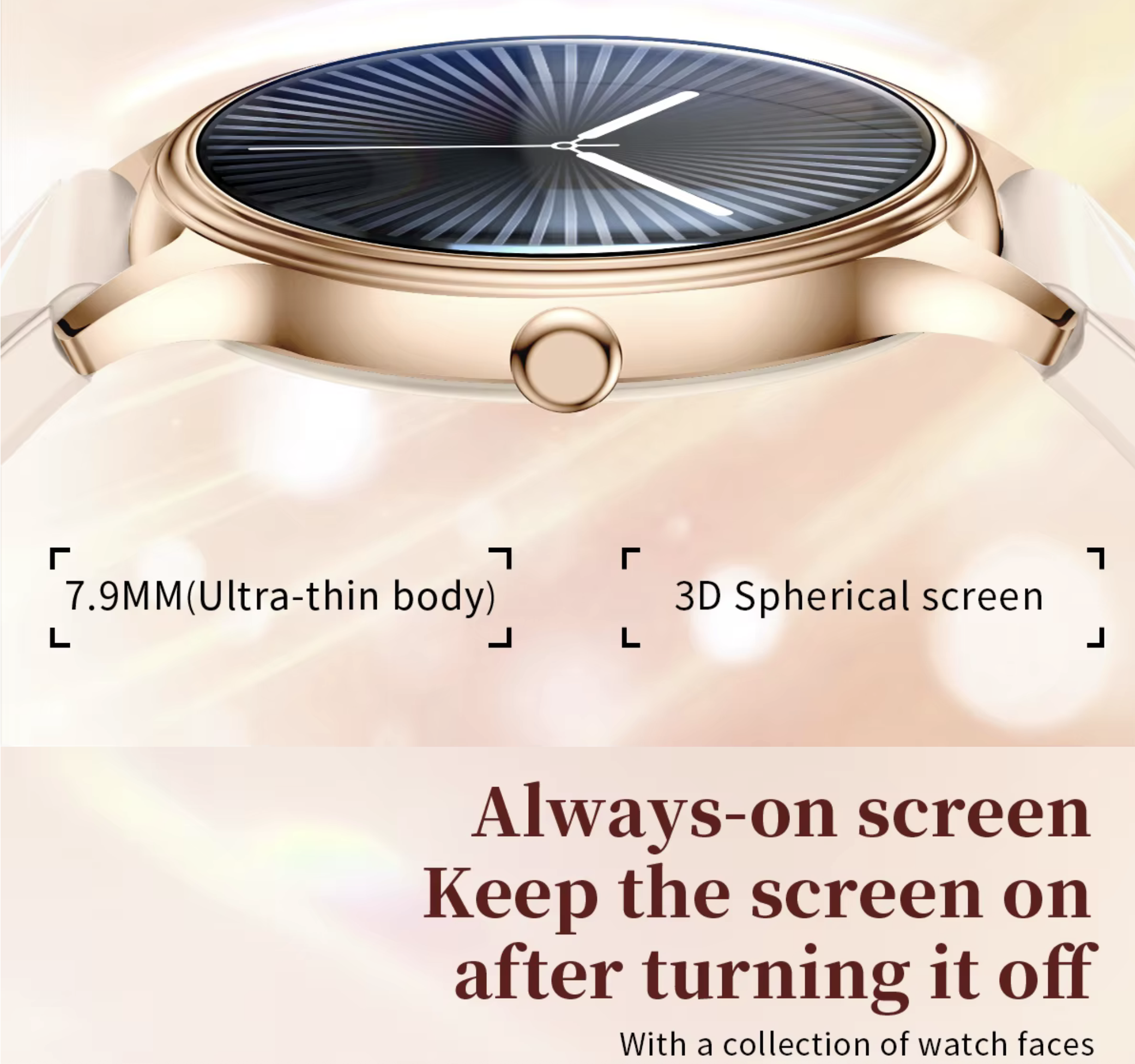 - Prémium anyagok és megjelenés: Az ötvözetből készült tok, a lila szilikon és a bőr szíj kombinációja elegáns és kényelmes viseletet biztosít. A 7.9 mm-es ultra-vékony test és a 3D gömb alakú képernyő igazi vizuális élményt nyújt.