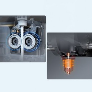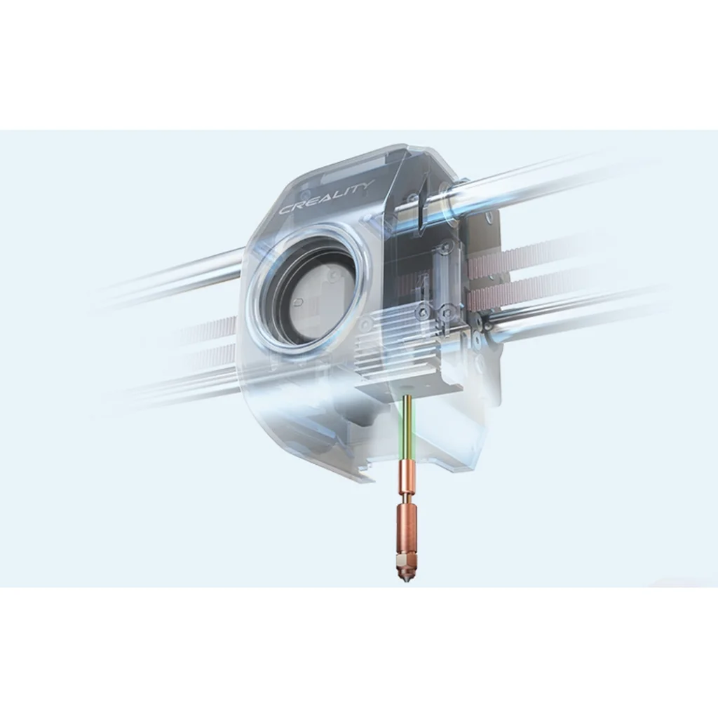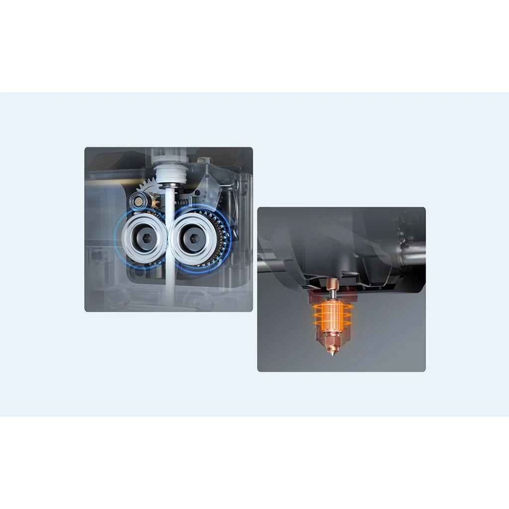 Kettős extruder - kevesebb elakadás, jobb anyagáramlás. A K1-SE-ben használt kettős extruder meghajtórendszer biztosítja a szál stabil adagolását, ami kevesebb elakadást és az anyagáramlás jobb kontrollálhatóságát eredményezi. A kerámia fűtőelem nagyon gyorsan felmelegszik, ami csökkenti az előnyomási időt. Emellett a titáncső és a nagy szilárdságú acélfúvóka hosszú élettartamot biztosít.