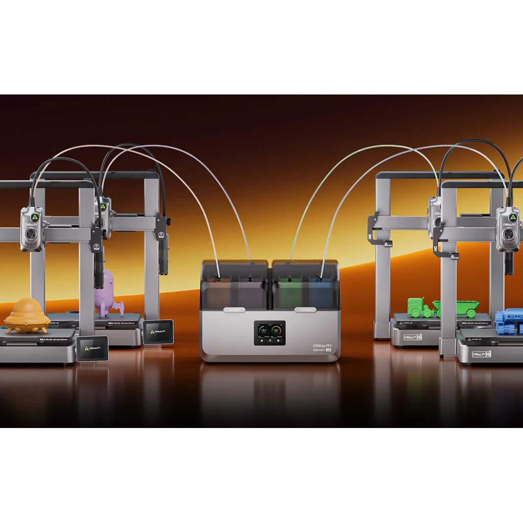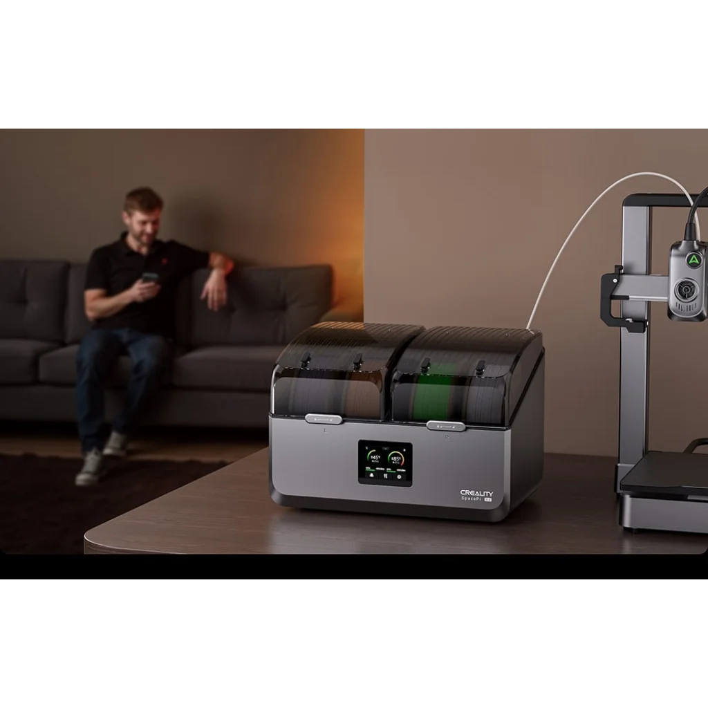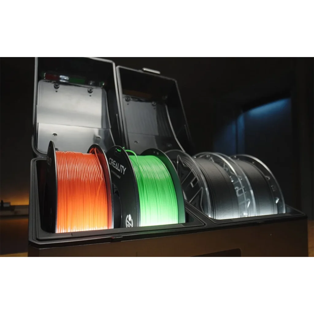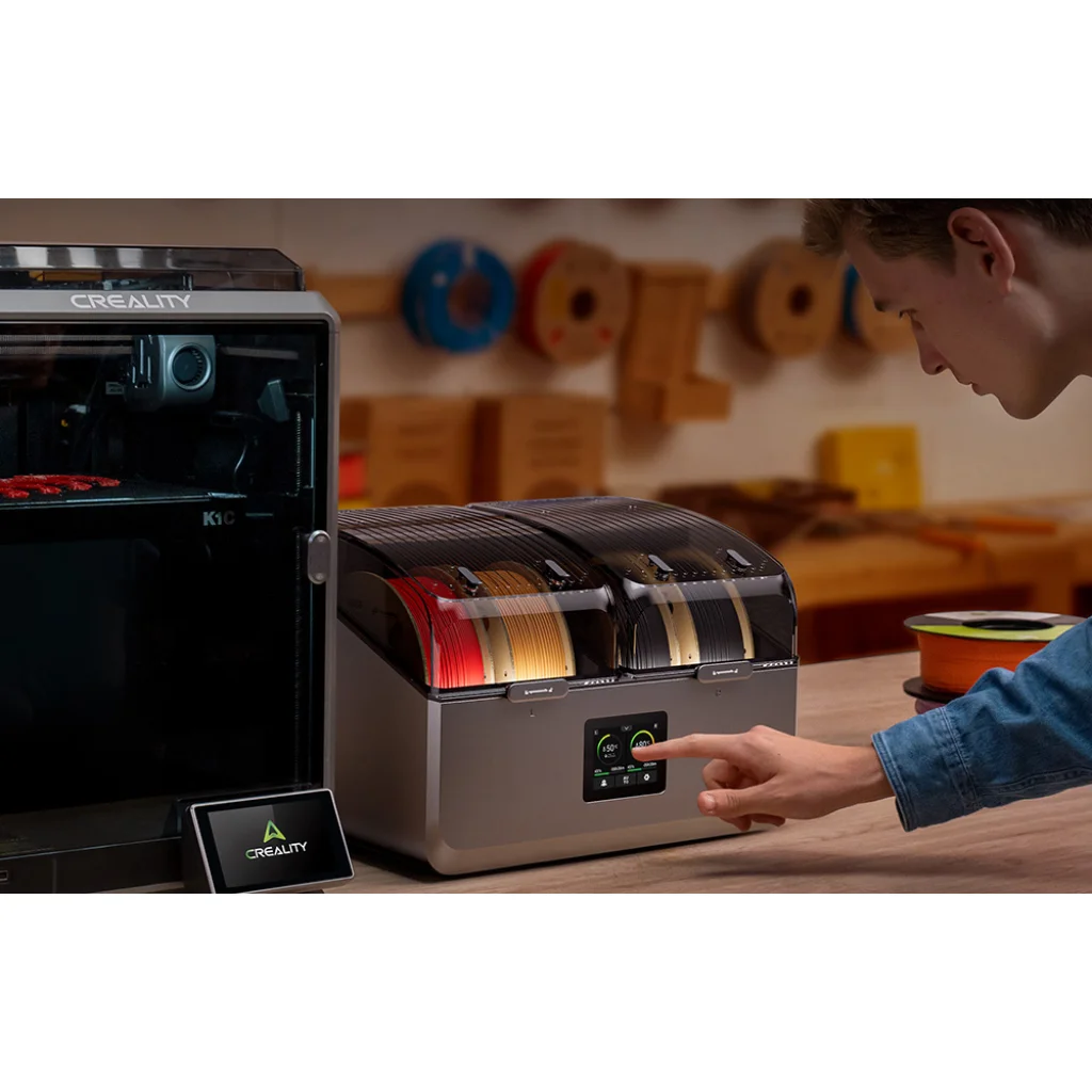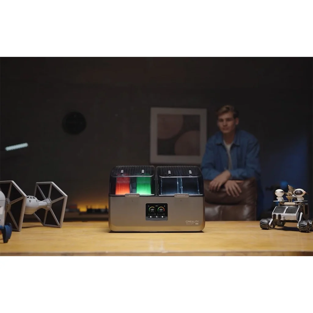 A Creality SpacePi X4 egy nagy teljesítményű, kétkamrás szálszárító, amely lehetővé teszi akár 4 orsó egyidejű szárítását is, 45 és 85°C közötti teljes hőmérséklet-szabályozással. Az aktív párátlanítási technológiának, a gyors fűtésnek és a csendes működésnek köszönhetően reprodukálhatóan és stabilan készítheti elő a PLA, PETG, TPU, ABS vagy PA-CF filamenteket nyomtatásra, kiküszöbölve a nedvesség, a buborékok és a nyomtatás közbeni ütődések problémáját.